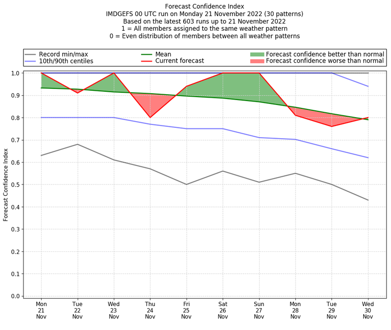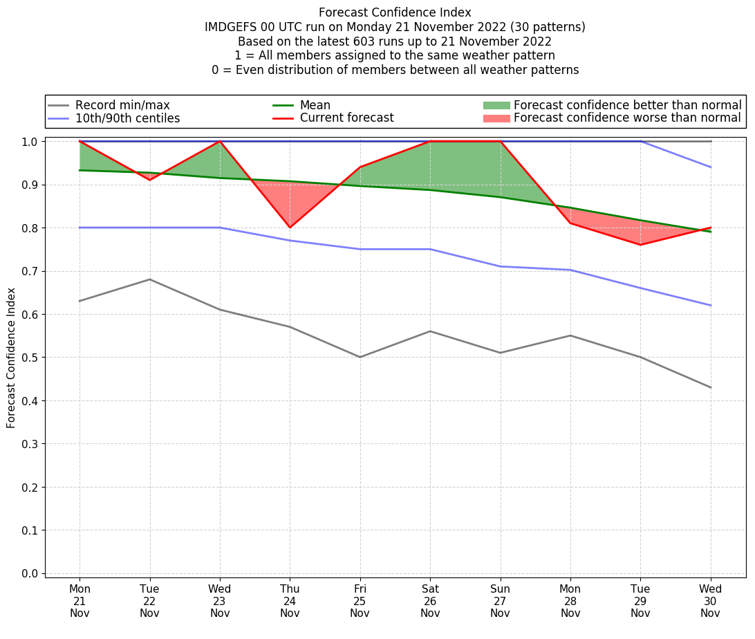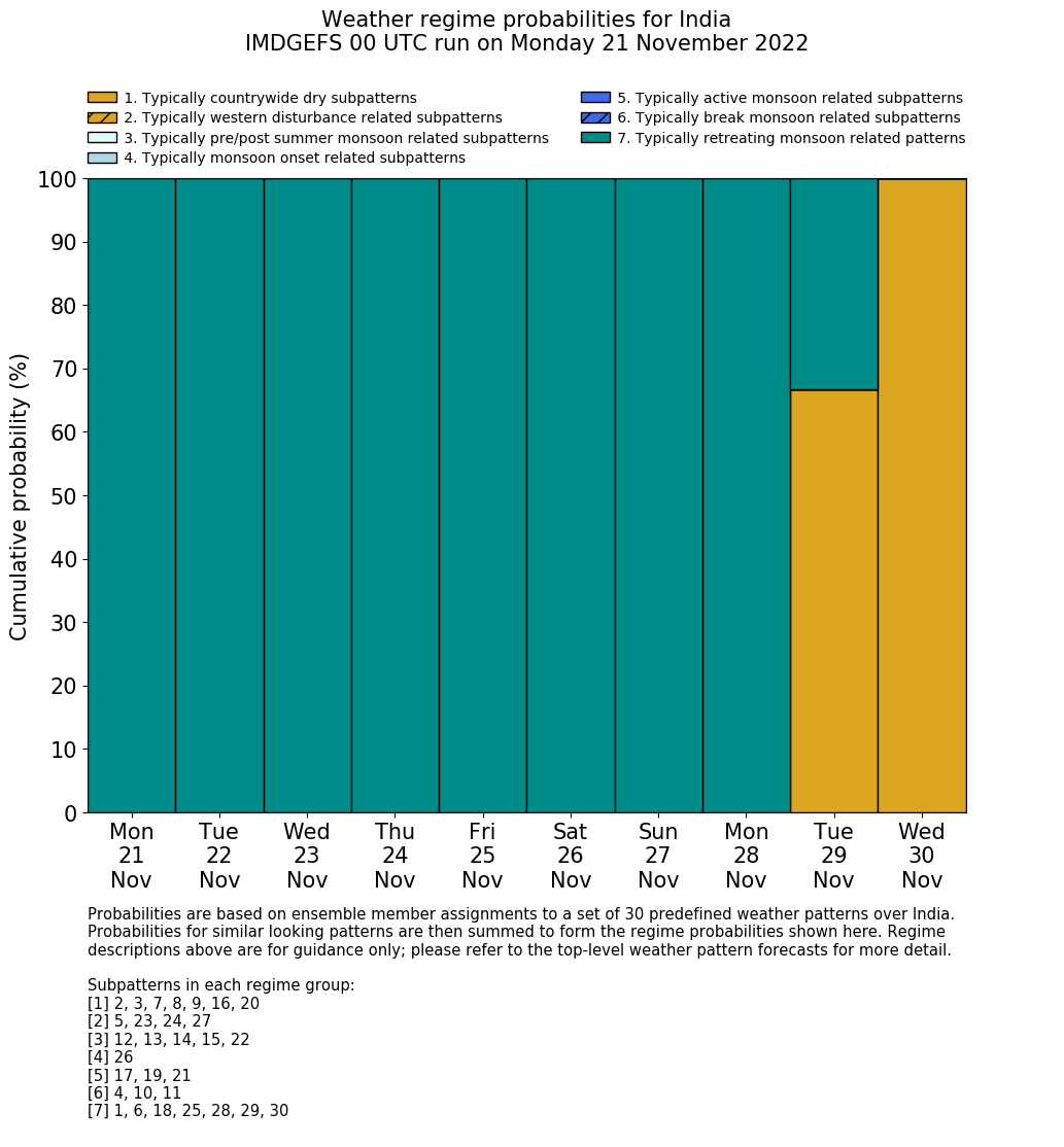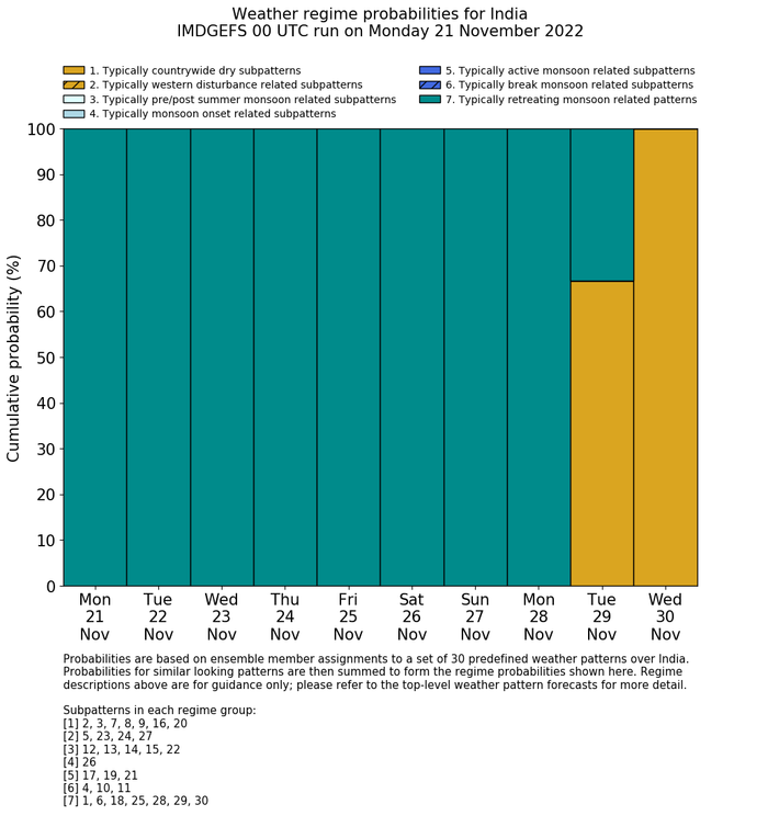 | Weather patterns typically associated with contrywide dry period tendencies over India are most likely Weather patterns 2, 3, 7, 8, 9, 16 and 20 (countrywide winter dry period) | |