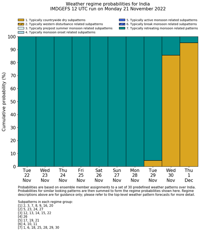 | Weather patterns typically associated with contrywide dry period tendencies over India are most likely Weather patterns 2, 3, 7, 8, 9, 16 and 20 (countrywide winter dry period) | |