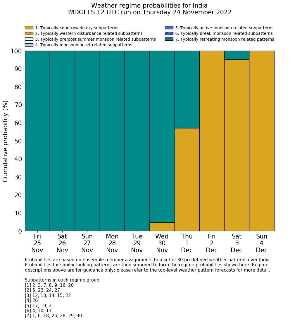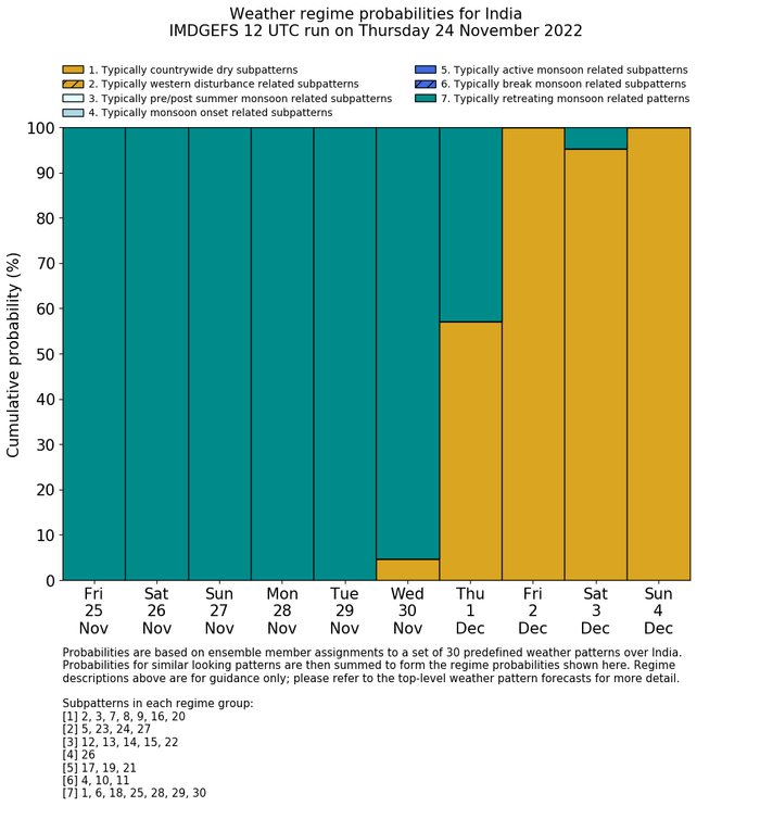| Weather patterns typically associated with contrywide dry period tendencies over India are most likely Weather patterns 2, 3, 7, 8, 9, 16 and 20 (countrywide winter dry period) | |