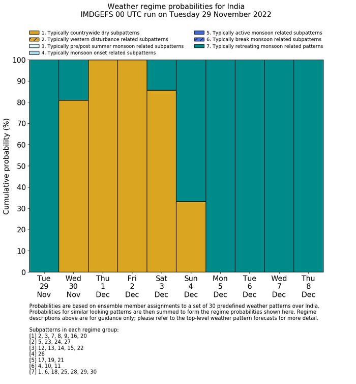 | Weather patterns typically associated with contrywide dry period tendencies over India are most likely Weather patterns 2, 3, 7, 8, 9, 16 and 20 (countrywide winter dry period) | |
