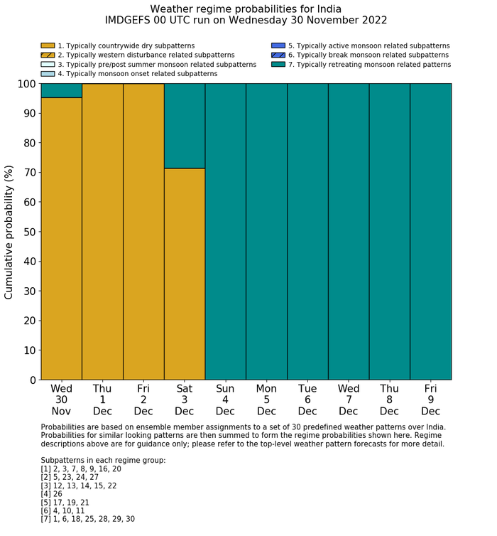 | Weather patterns typically associated with contrywide dry period tendencies over India are most likely Weather patterns 2, 3, 7, 8, 9, 16 and 20 (countrywide winter dry period) | |