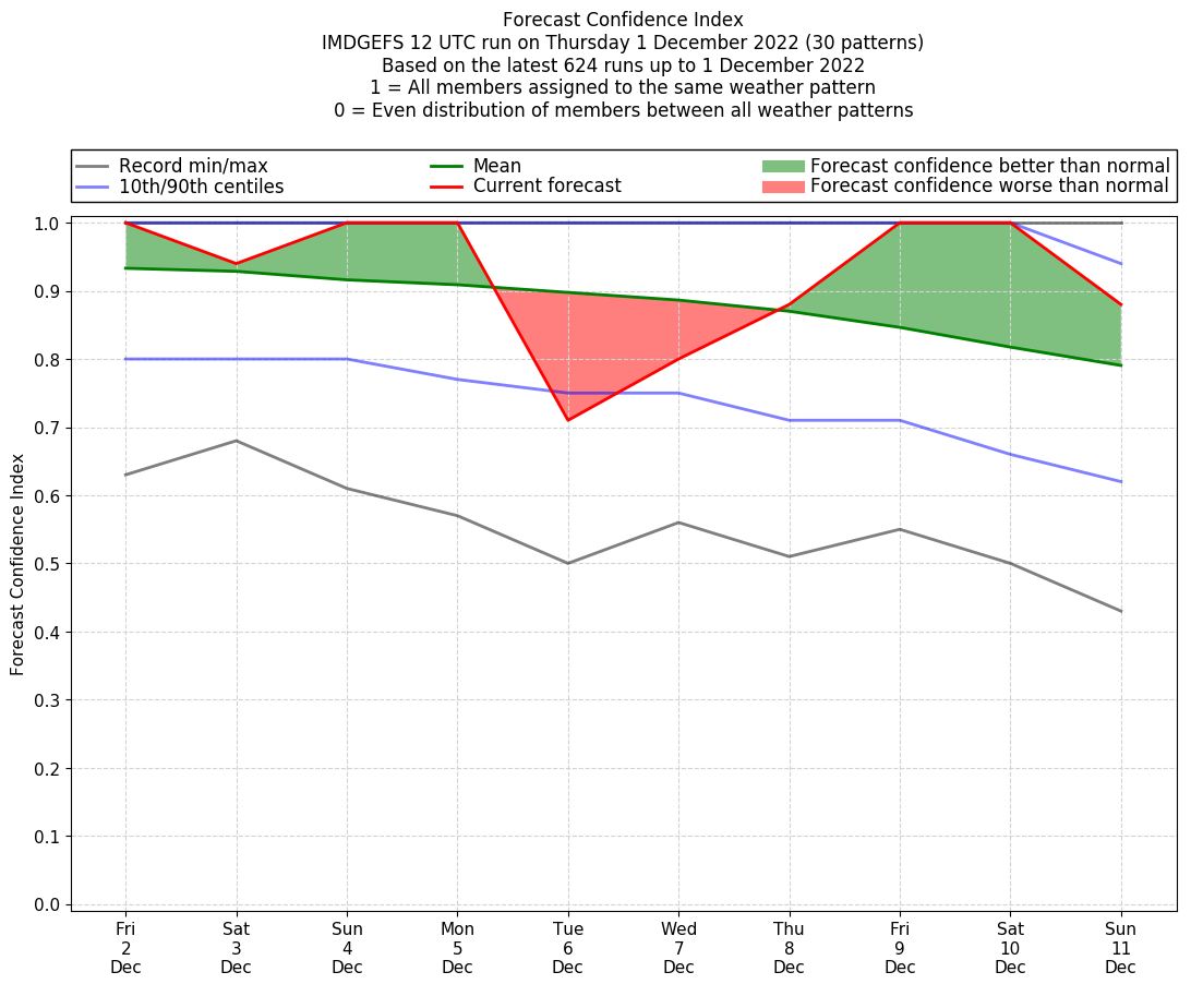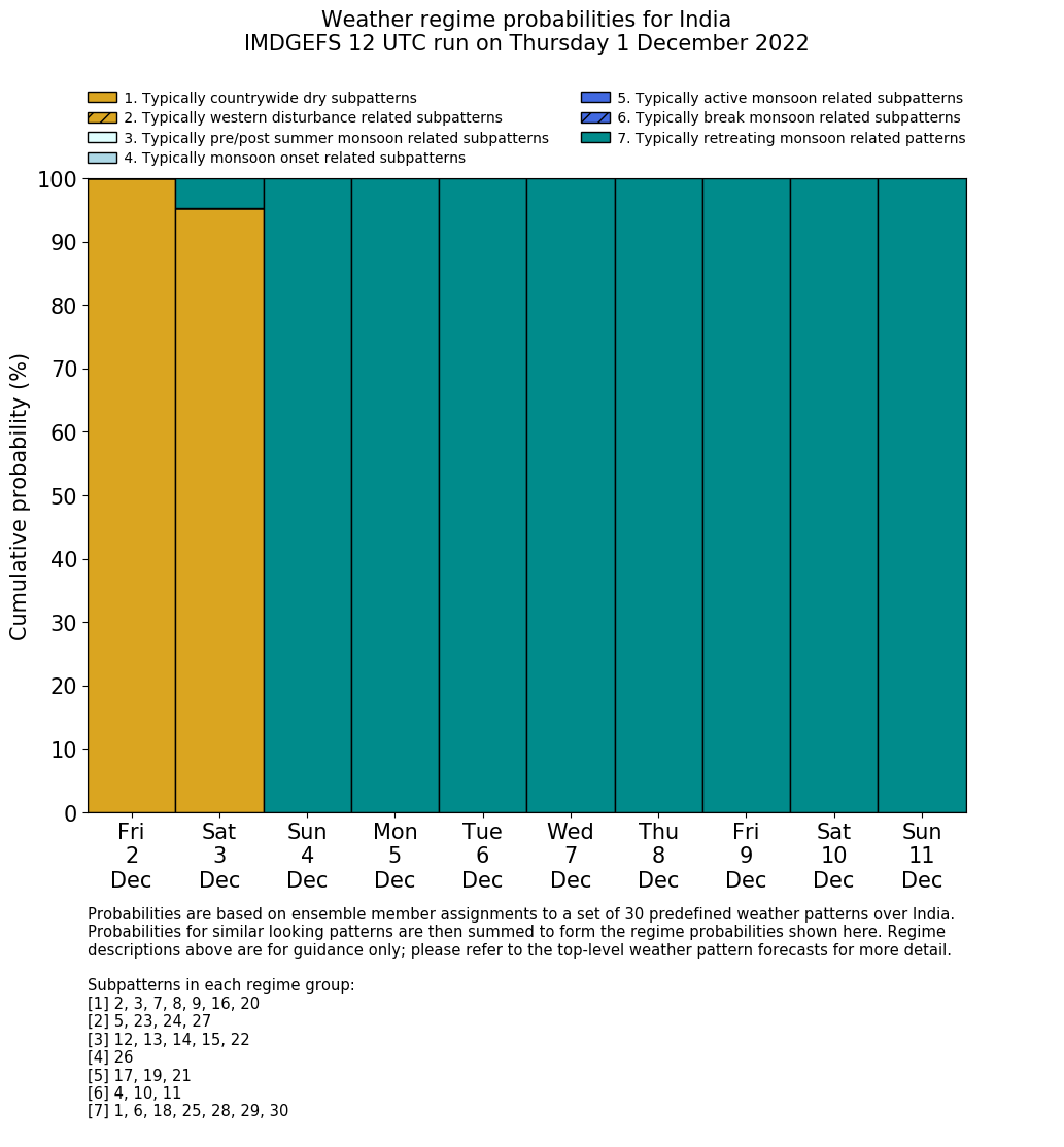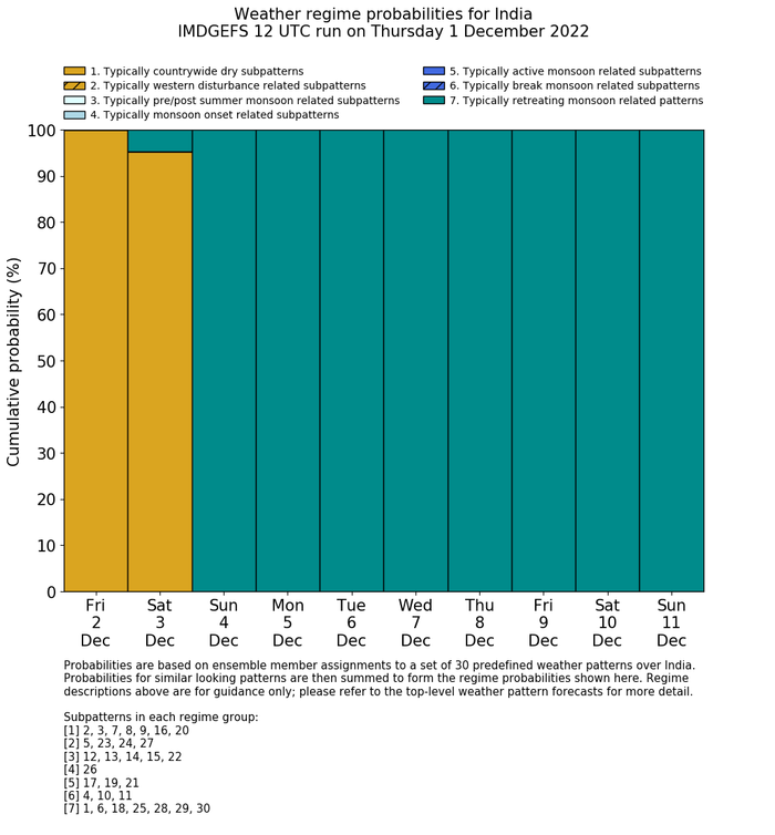 | Weather patterns typically associated with contrywide dry period tendencies over India are most likely Weather patterns 2, 3, 7, 8, 9, 16 and 20 (countrywide winter dry period) | |
