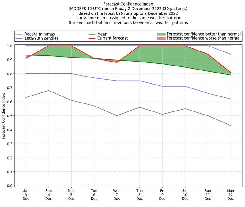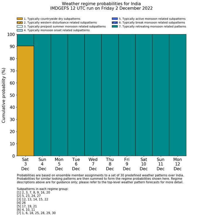 | Weather patterns typically associated with contrywide dry period tendencies over India are most likely Weather patterns 2, 3, 7, 8, 9, 16 and 20 (countrywide winter dry period) | |