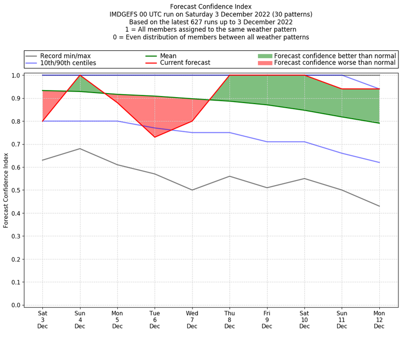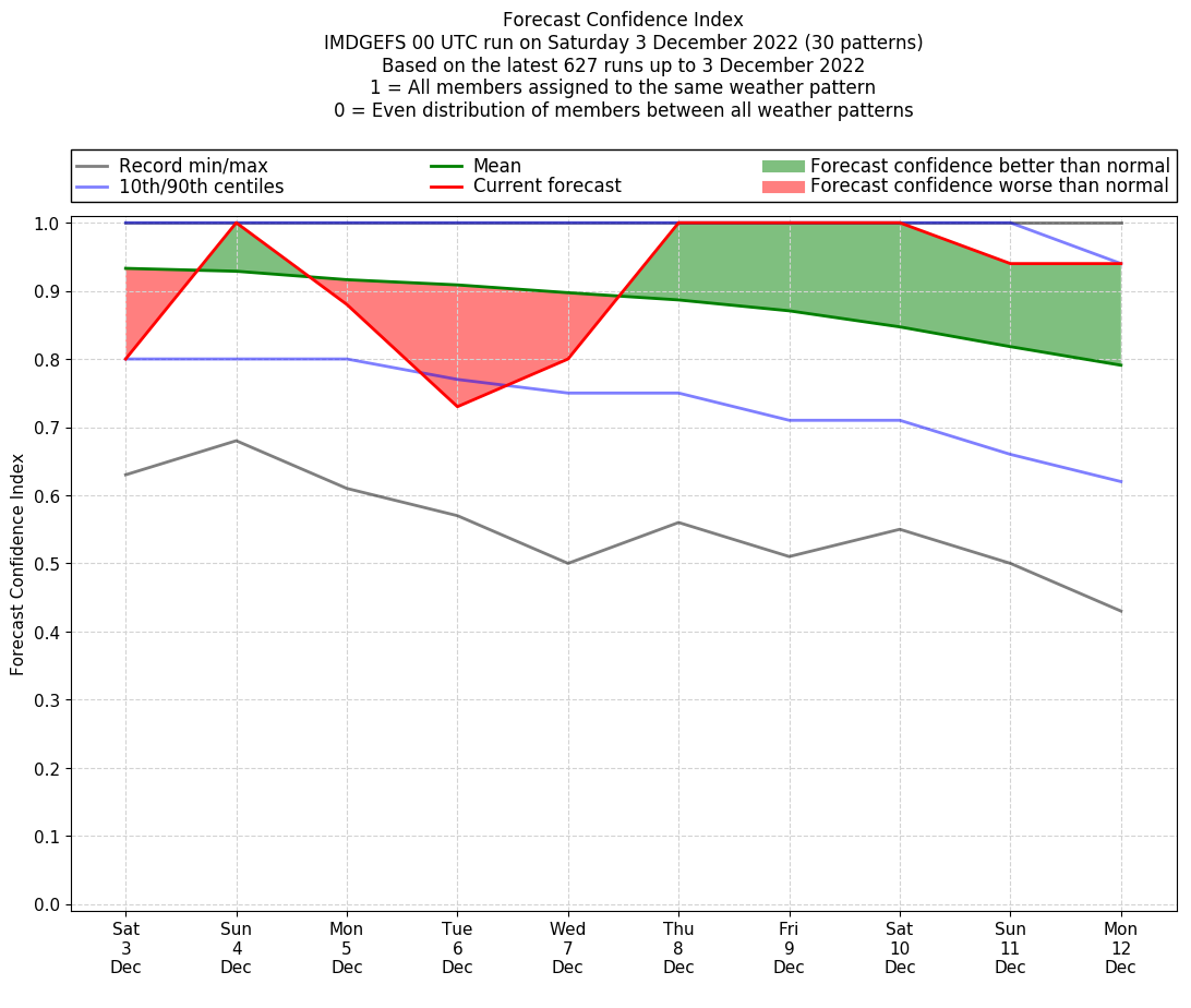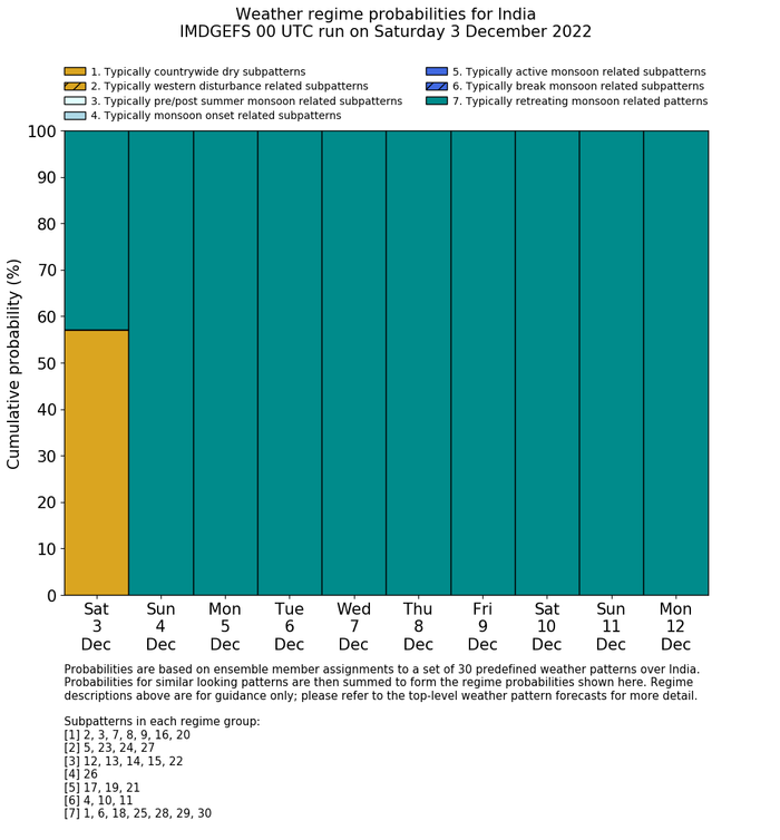 | Weather patterns typically associated with contrywide dry period tendencies over India are most likely Weather patterns 2, 3, 7, 8, 9, 16 and 20 (countrywide winter dry period) | |