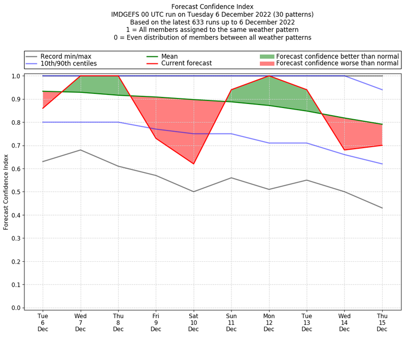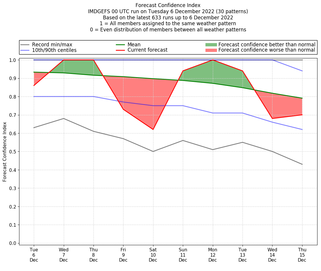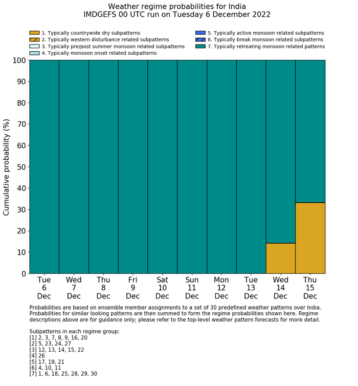 | Weather patterns typically associated with contrywide dry period tendencies over India are most likely Weather patterns 2, 3, 7, 8, 9, 16 and 20 (countrywide winter dry period) | |