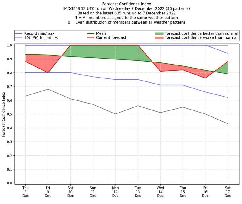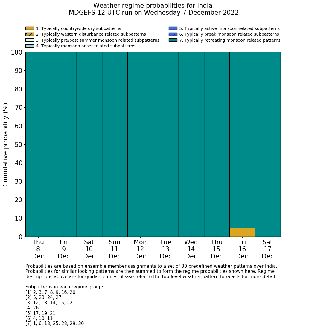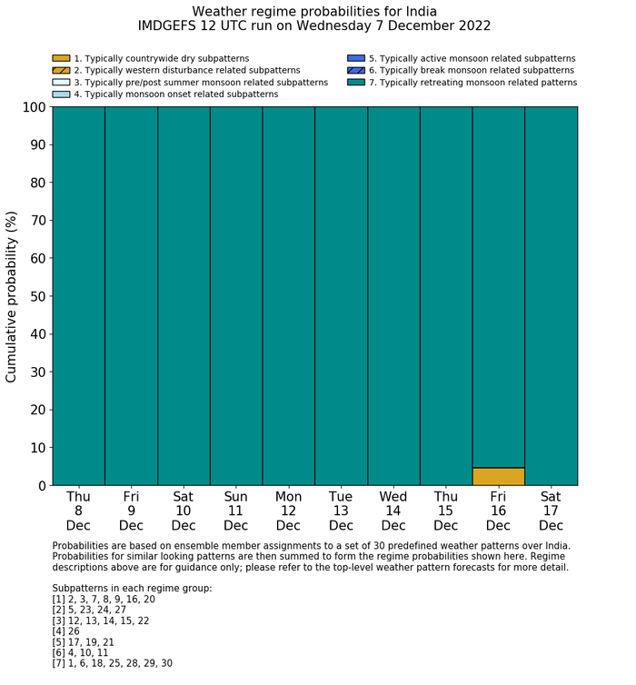 | Weather patterns typically associated with contrywide dry period tendencies over India are most likely Weather patterns 2, 3, 7, 8, 9, 16 and 20 (countrywide winter dry period) | |