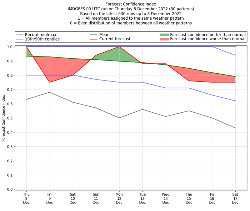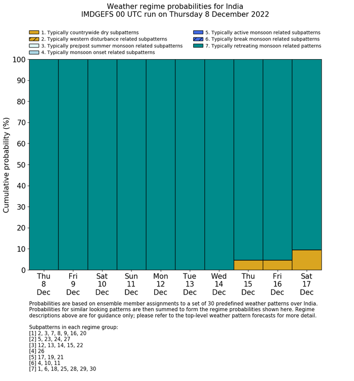 | Weather patterns typically associated with contrywide dry period tendencies over India are most likely Weather patterns 2, 3, 7, 8, 9, 16 and 20 (countrywide winter dry period) | |