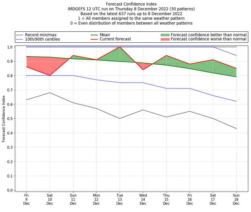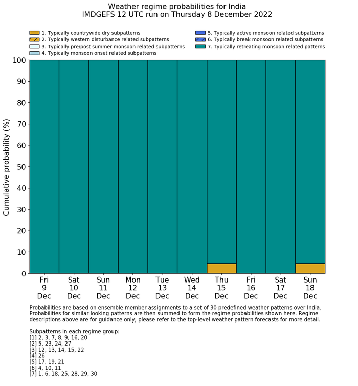 | Weather patterns typically associated with contrywide dry period tendencies over India are most likely Weather patterns 2, 3, 7, 8, 9, 16 and 20 (countrywide winter dry period) | |
