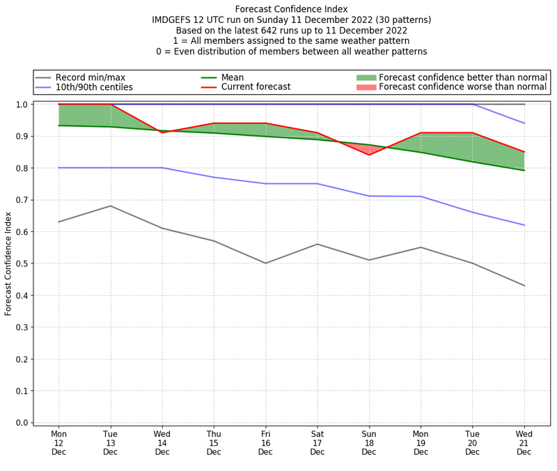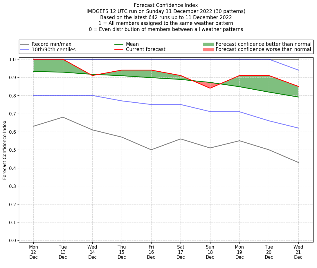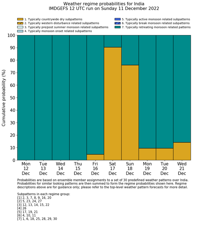| Weather patterns typically associated with contrywide dry period tendencies over India are most likely Weather patterns 2, 3, 7, 8, 9, 16 and 20 (countrywide winter dry period) | |