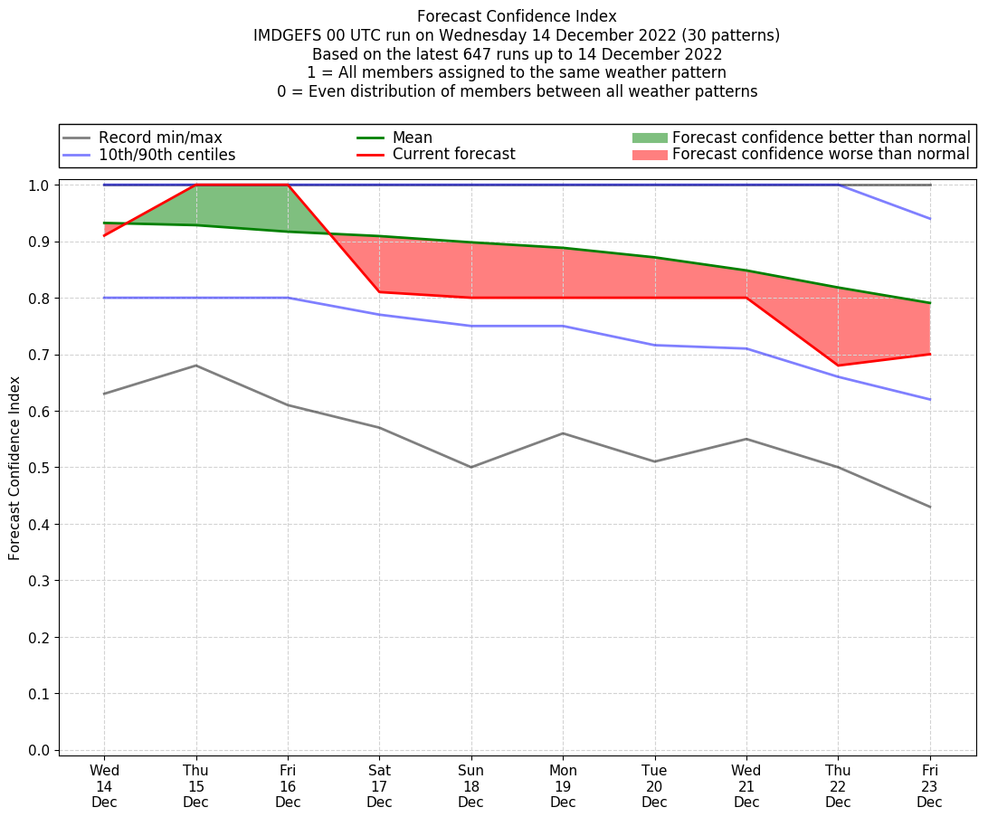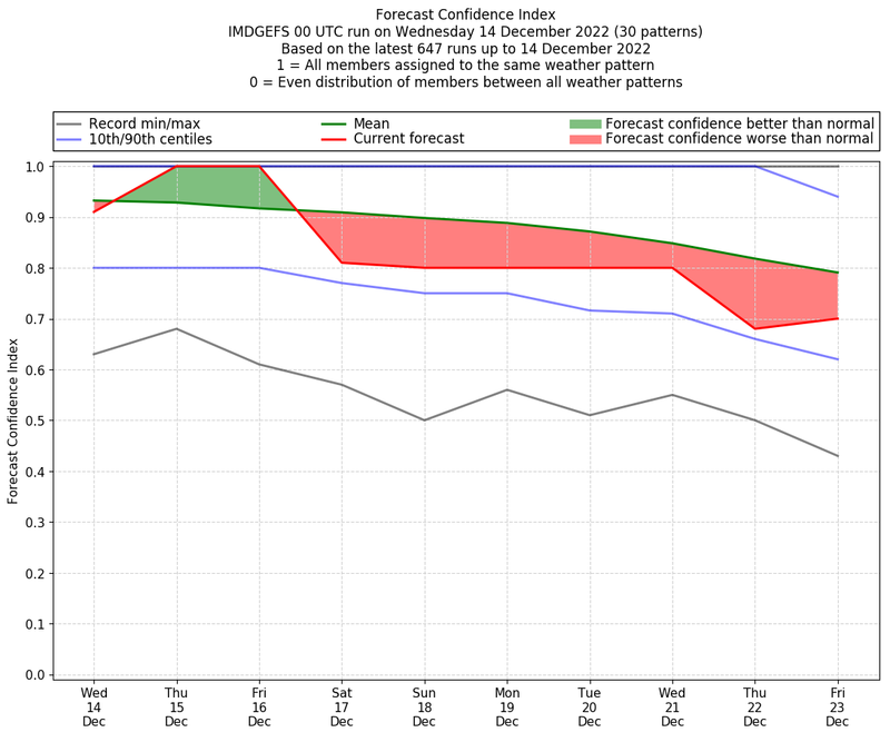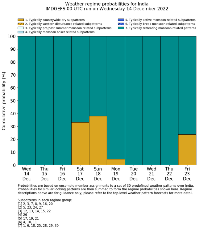 | Weather patterns typically associated with contrywide dry period tendencies over India are most likely Weather patterns 2, 3, 7, 8, 9, 16 and 20 (countrywide winter dry period) | |