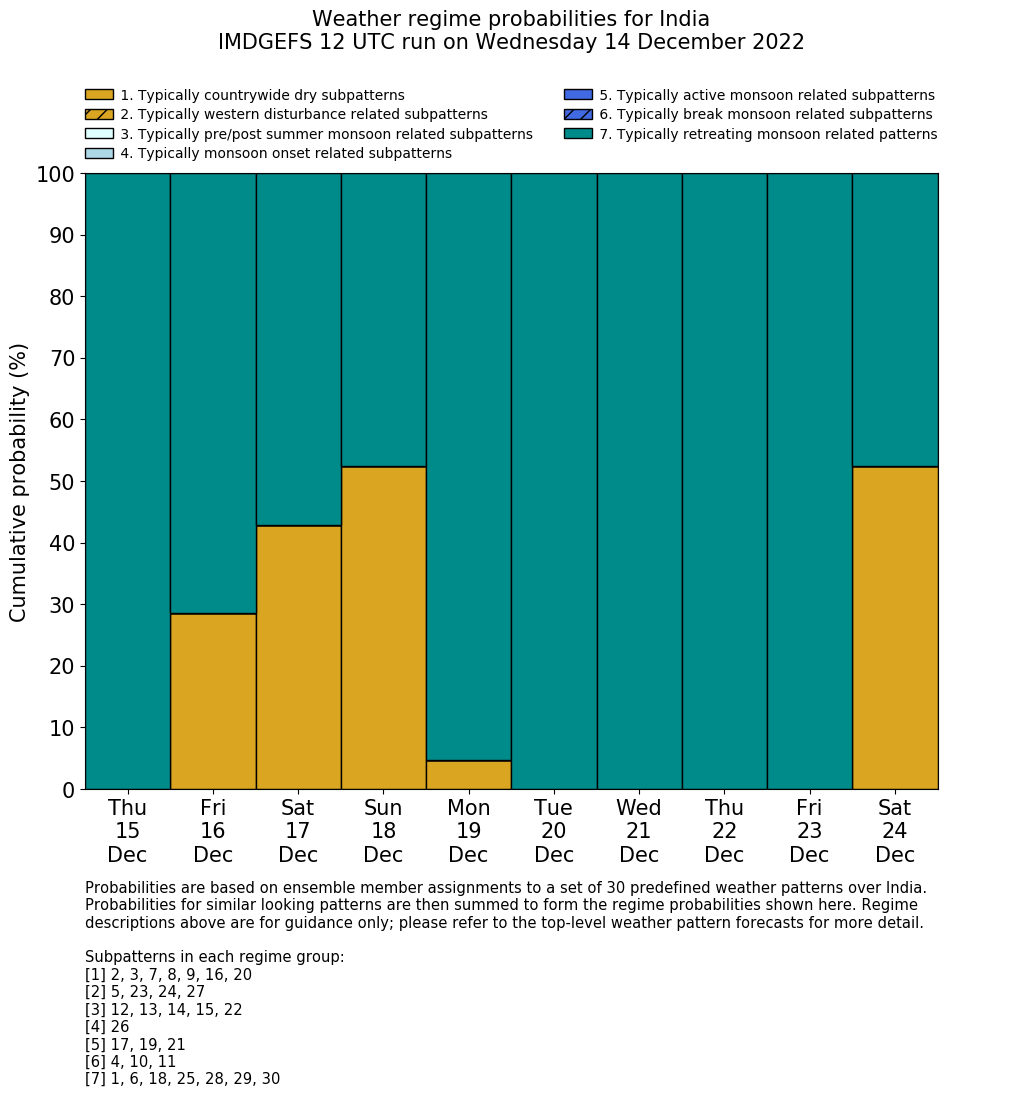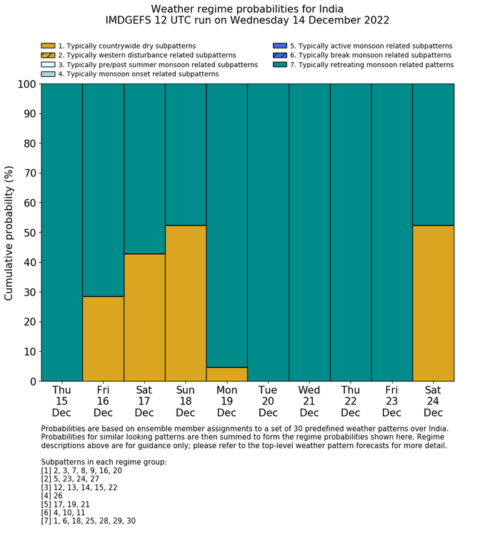| Weather patterns typically associated with contrywide dry period tendencies over India are most likely Weather patterns 2, 3, 7, 8, 9, 16 and 20 (countrywide winter dry period) | |