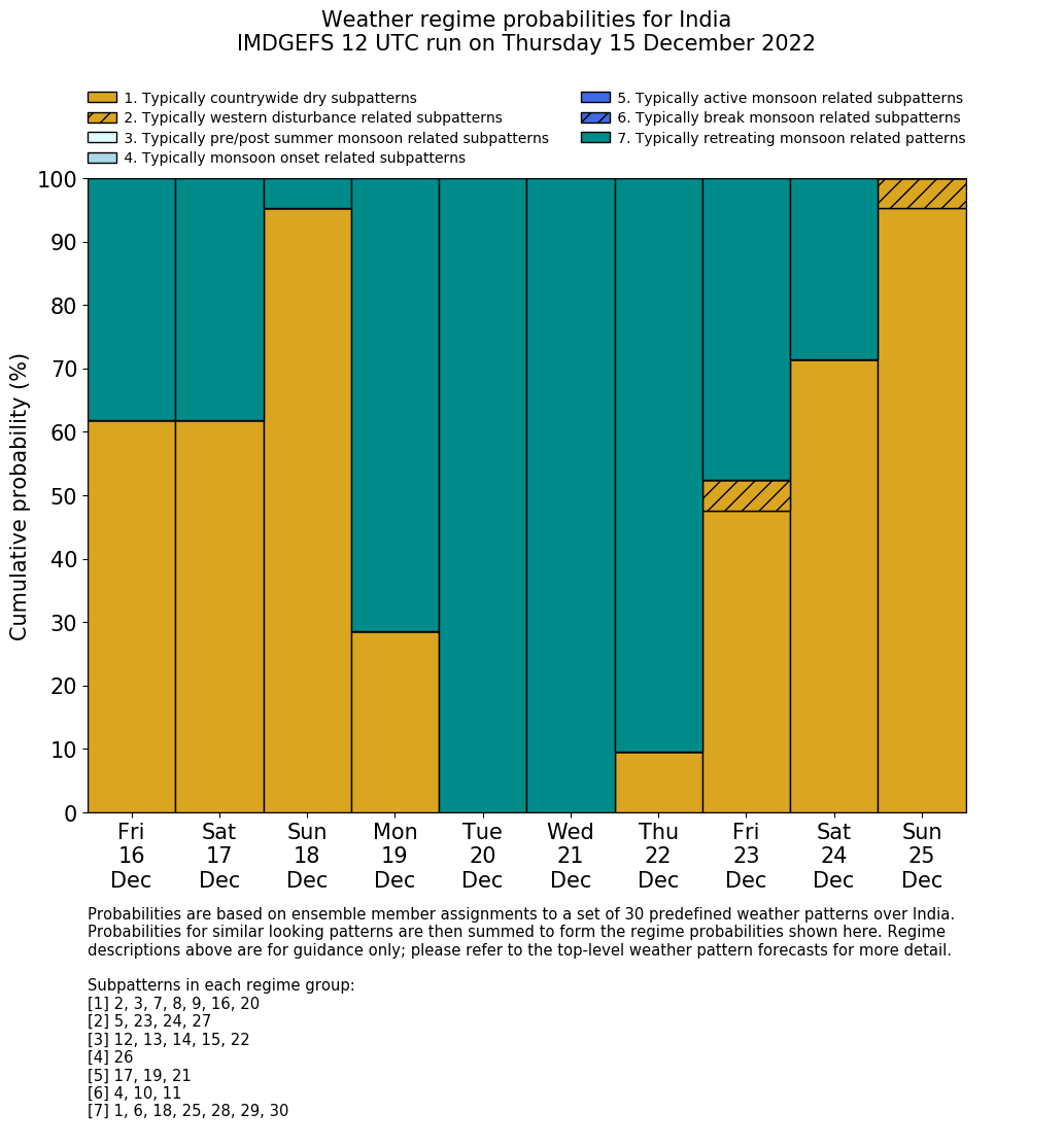 | Weather patterns typically associated with contrywide dry period tendencies over India are most likely Weather patterns 2, 3, 7, 8, 9, 16 and 20 (countrywide winter dry period) | |