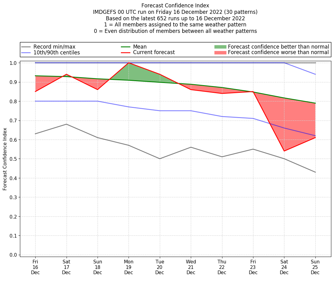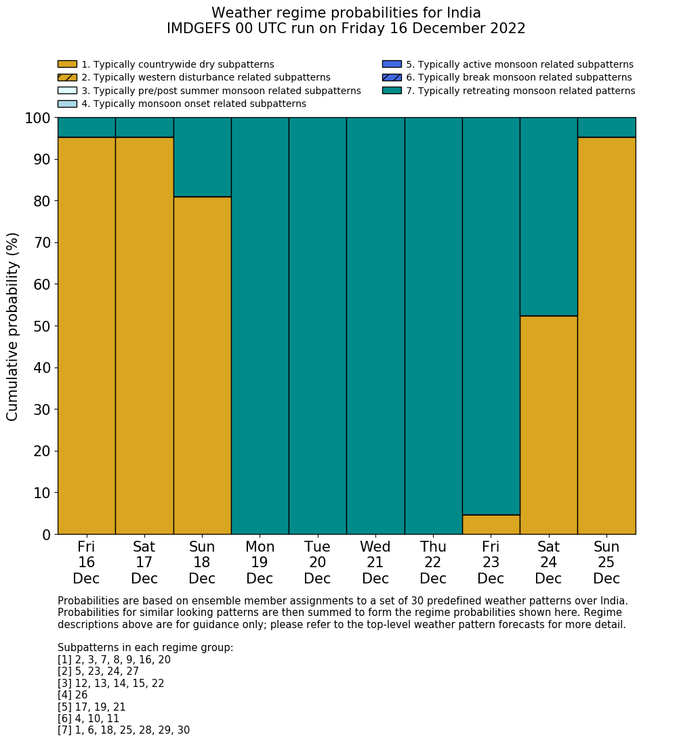 | Weather patterns typically associated with contrywide dry period tendencies over India are most likely Weather patterns 2, 3, 7, 8, 9, 16 and 20 (countrywide winter dry period) | |