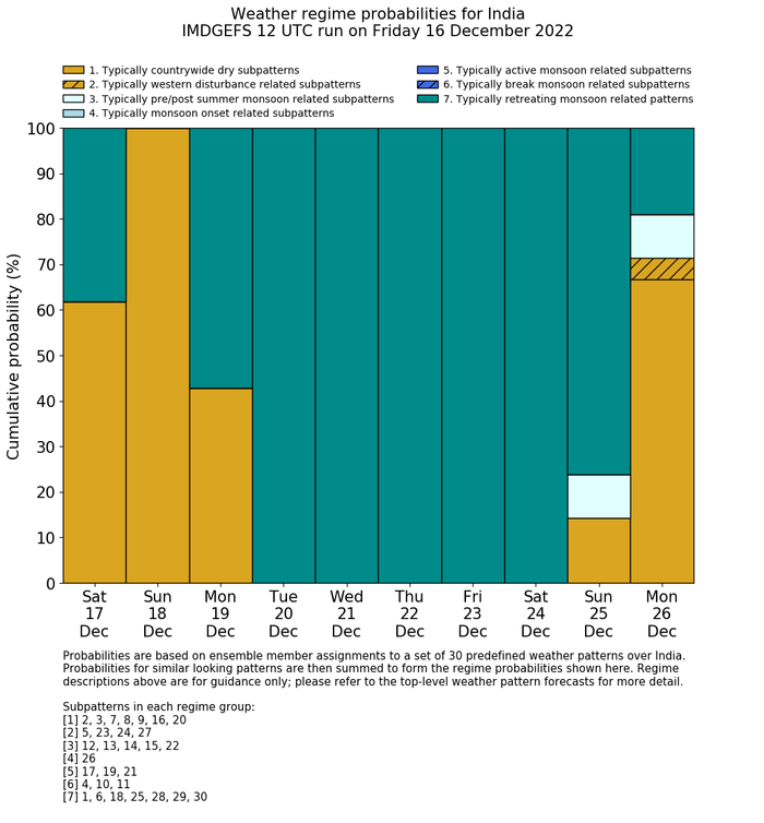 | Weather patterns typically associated with contrywide dry period tendencies over India are most likely Weather patterns 2, 3, 7, 8, 9, 16 and 20 (countrywide winter dry period) | |