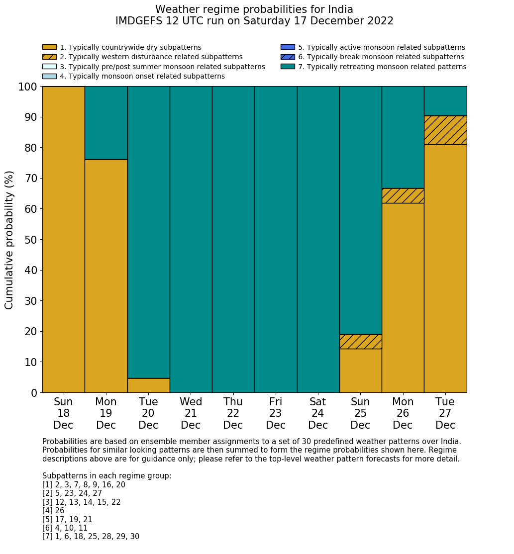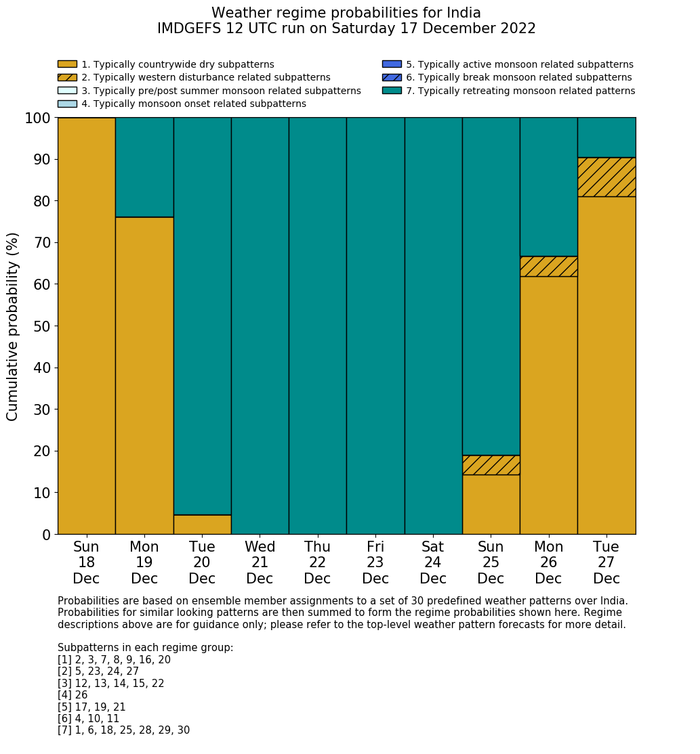 | Weather patterns typically associated with contrywide dry period tendencies over India are most likely Weather patterns 2, 3, 7, 8, 9, 16 and 20 (countrywide winter dry period) | |