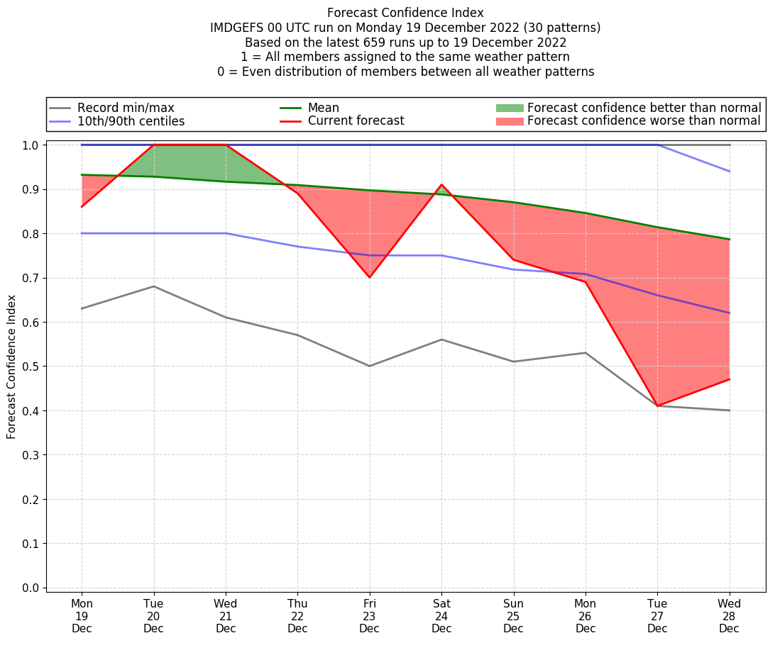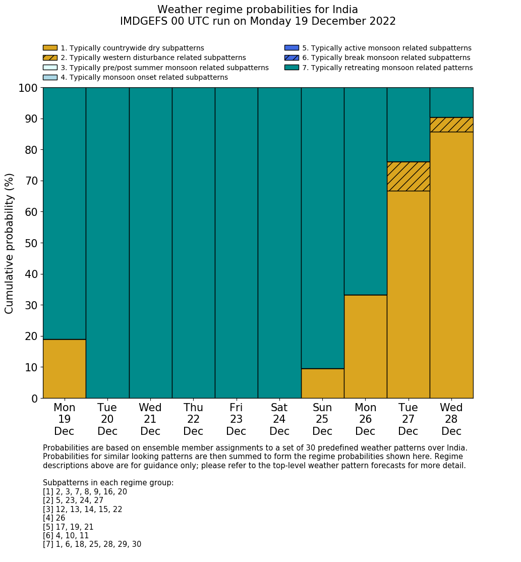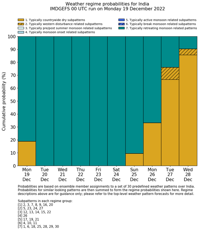 | Weather patterns typically associated with contrywide dry period tendencies over India are most likely Weather patterns 2, 3, 7, 8, 9, 16 and 20 (countrywide winter dry period) | |