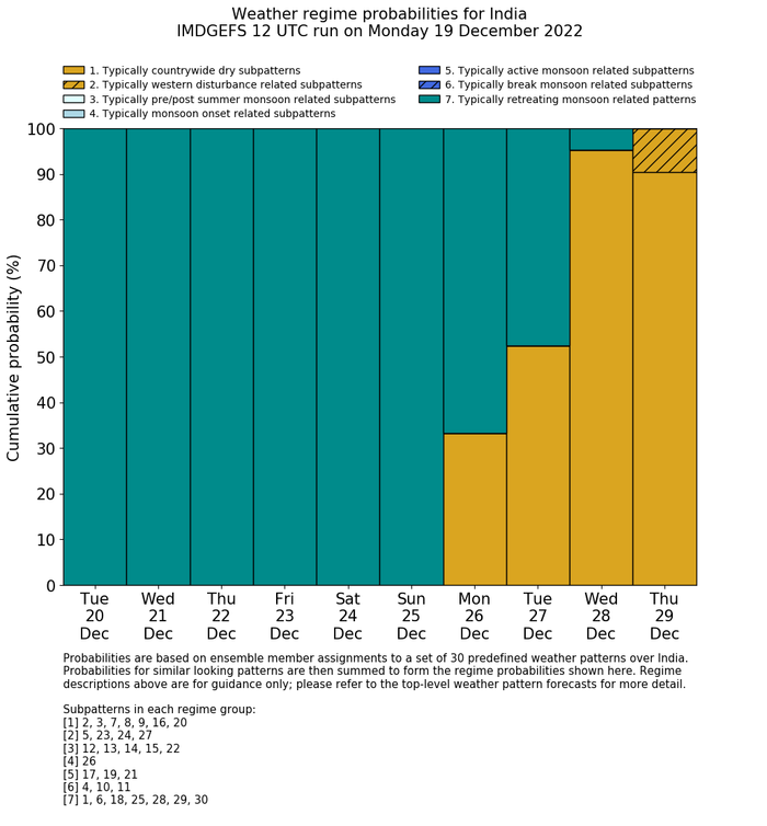 | Weather patterns typically associated with contrywide dry period tendencies over India are most likely Weather patterns 2, 3, 7, 8, 9, 16 and 20 (countrywide winter dry period) | |