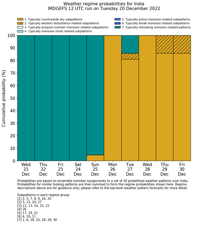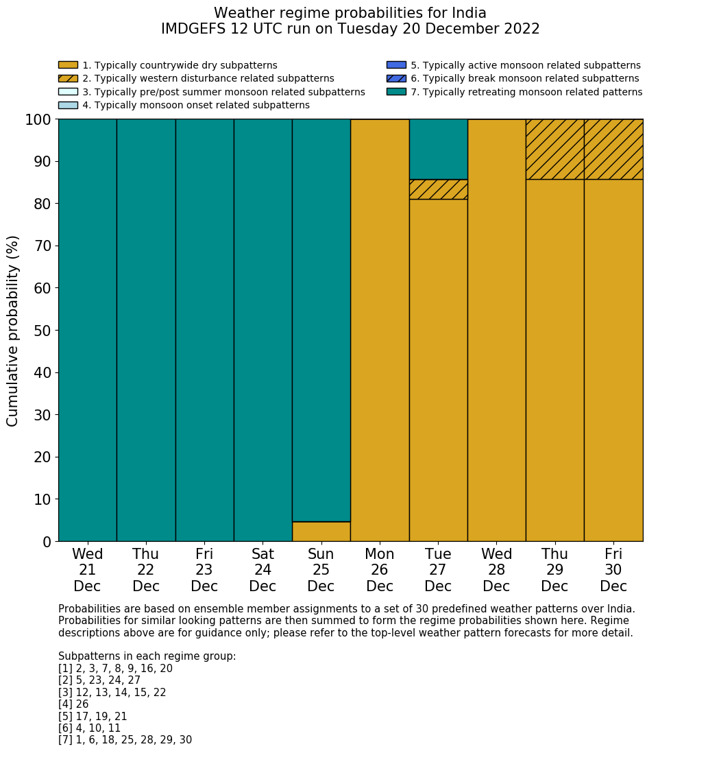| Weather patterns typically associated with contrywide dry period tendencies over India are most likely Weather patterns 2, 3, 7, 8, 9, 16 and 20 (countrywide winter dry period) | |
