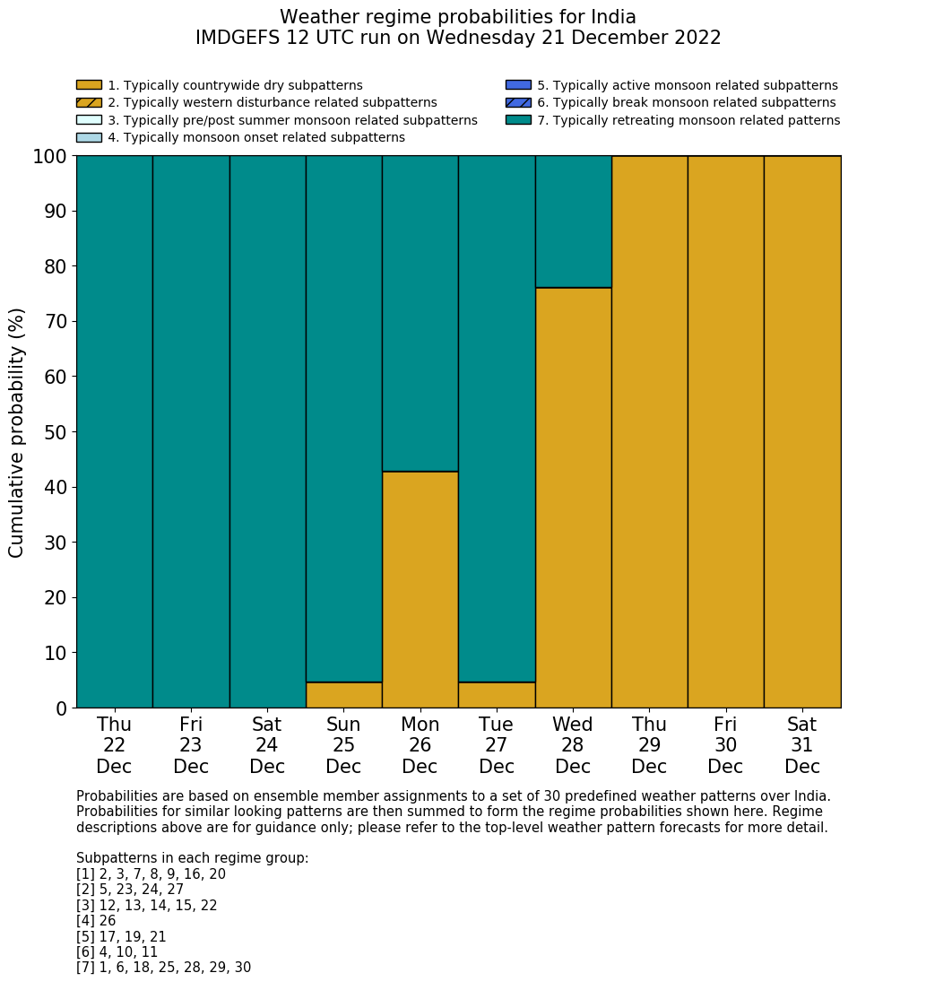 | Weather patterns typically associated with contrywide dry period tendencies over India are most likely Weather patterns 2, 3, 7, 8, 9, 16 and 20 (countrywide winter dry period) | |
