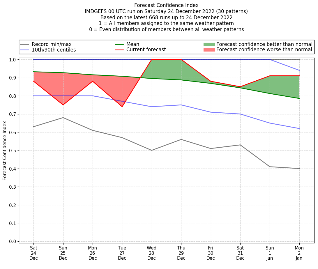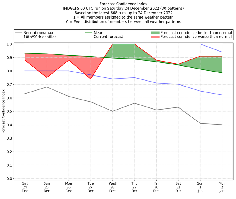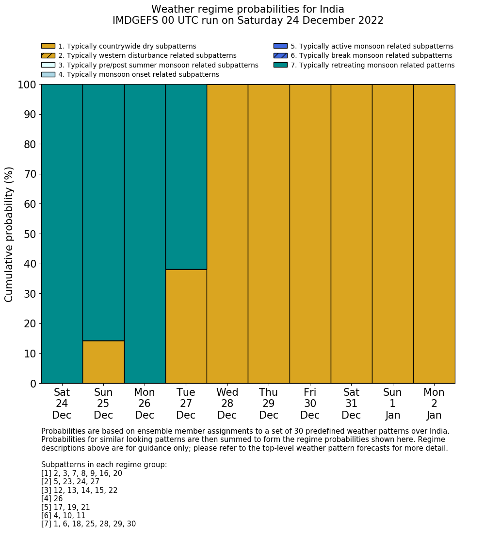 | Weather patterns typically associated with contrywide dry period tendencies over India are most likely Weather patterns 2, 3, 7, 8, 9, 16 and 20 (countrywide winter dry period) | |