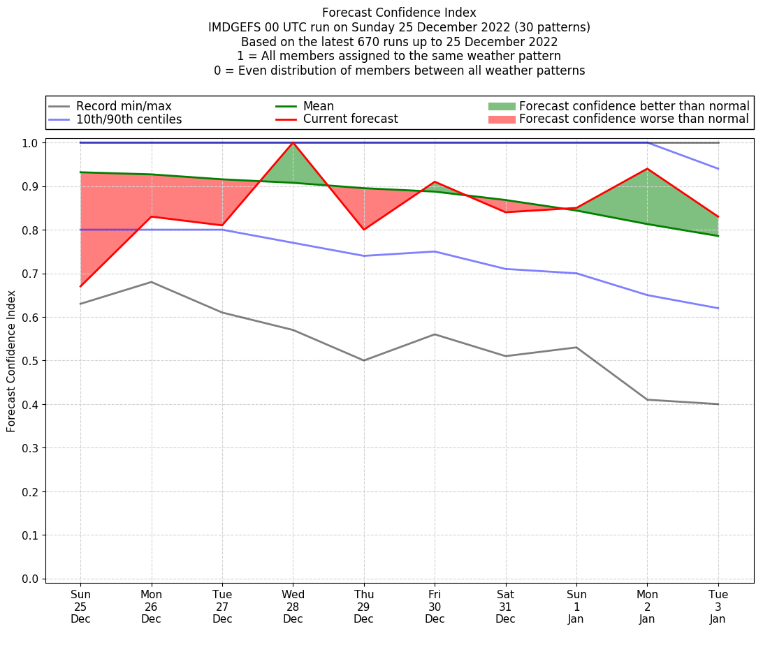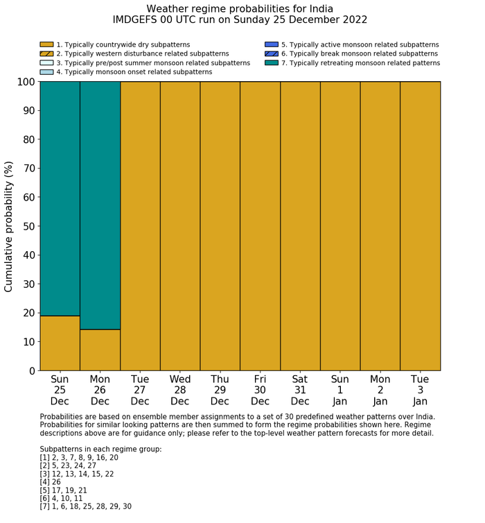 | Weather patterns typically associated with contrywide dry period tendencies over India are most likely Weather patterns 2, 3, 7, 8, 9, 16 and 20 (countrywide winter dry period) | |