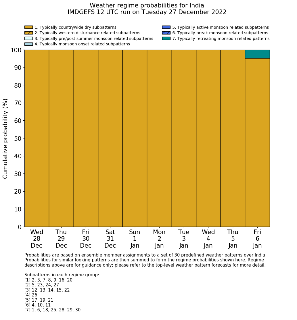 | Weather patterns typically associated with contrywide dry period tendencies over India are most likely Weather patterns 2, 3, 7, 8, 9, 16 and 20 (countrywide winter dry period) | |