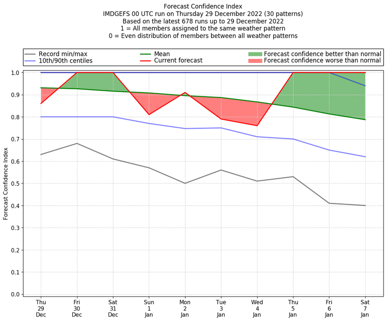| Weather patterns typically associated with contrywide dry period tendencies over India are most likely Weather patterns 2, 3, 7, 8, 9, 16 and 20 (countrywide winter dry period) | |