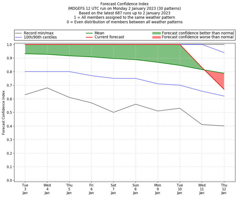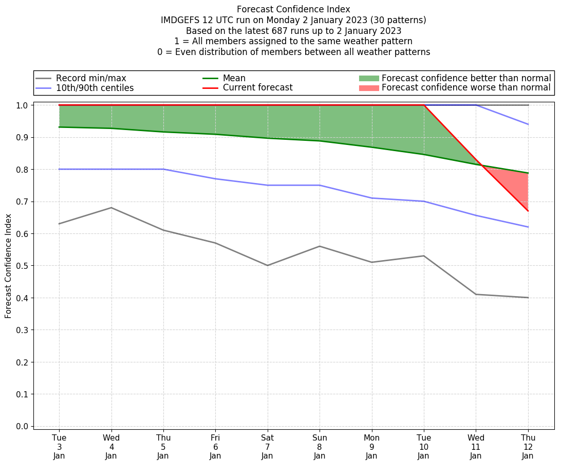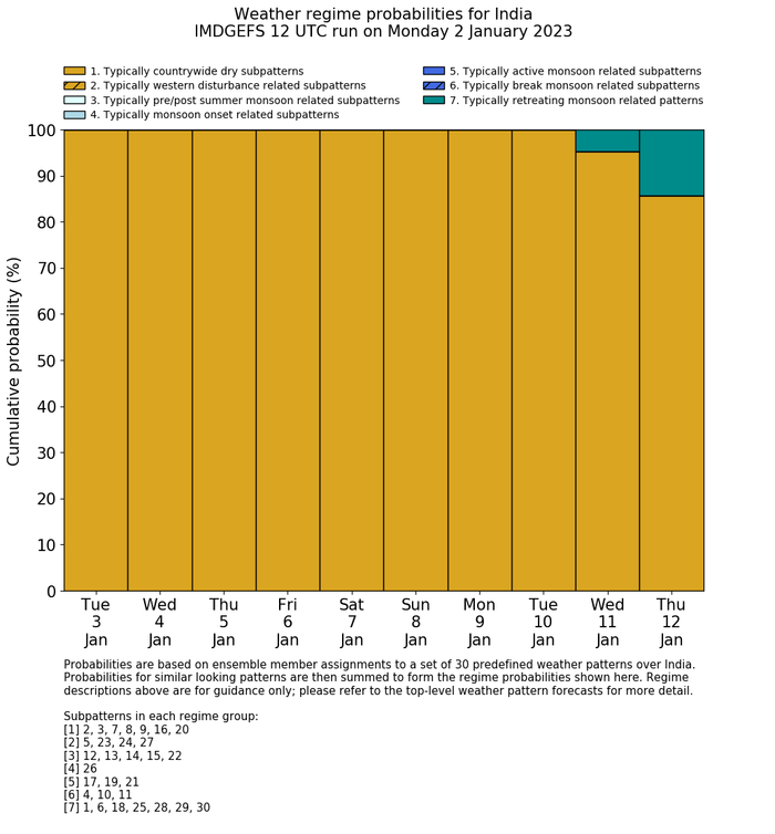 | Weather patterns typically associated with contrywide dry period tendencies over India are most likely Weather patterns 2, 3, 7, 8, 9, 16 and 20 (countrywide winter dry period) | |