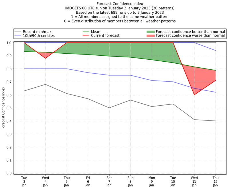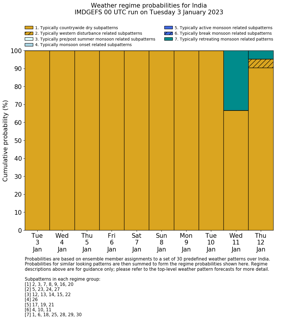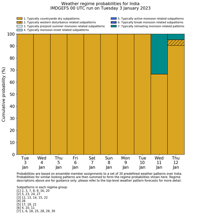 | Weather patterns typically associated with contrywide dry period tendencies over India are most likely Weather patterns 2, 3, 7, 8, 9, 16 and 20 (countrywide winter dry period) | |
