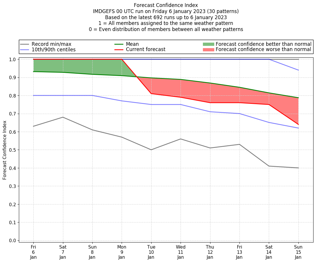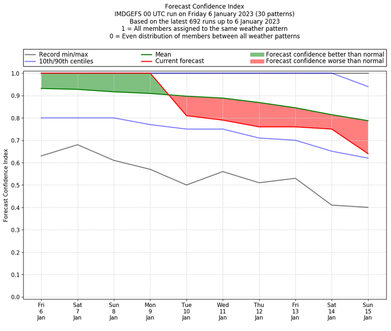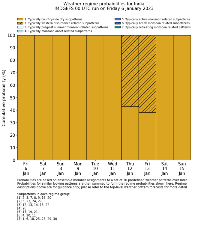 | Weather patterns typically associated with contrywide dry period tendencies over India are most likely Weather patterns 2, 3, 7, 8, 9, 16 and 20 (countrywide winter dry period) | |