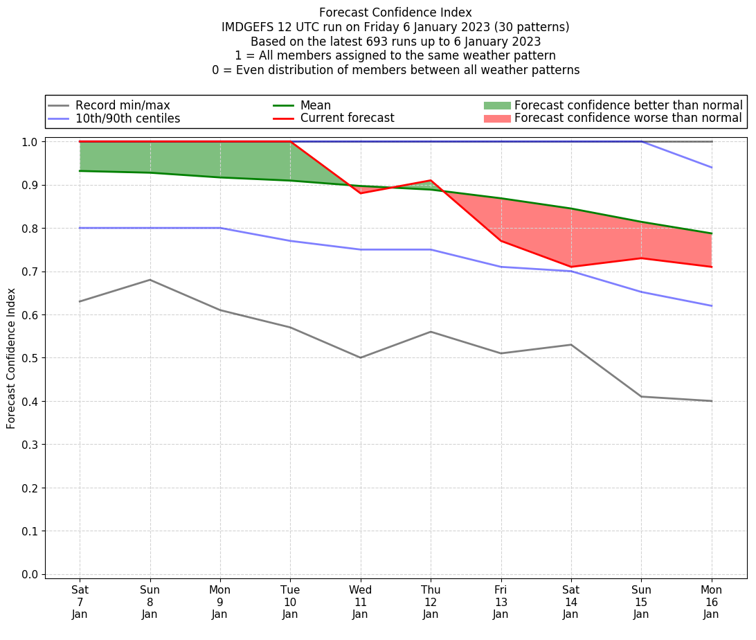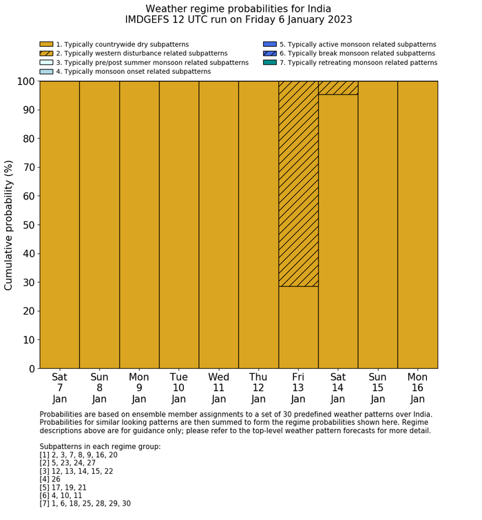 | Weather patterns typically associated with contrywide dry period tendencies over India are most likely Weather patterns 2, 3, 7, 8, 9, 16 and 20 (countrywide winter dry period) | |