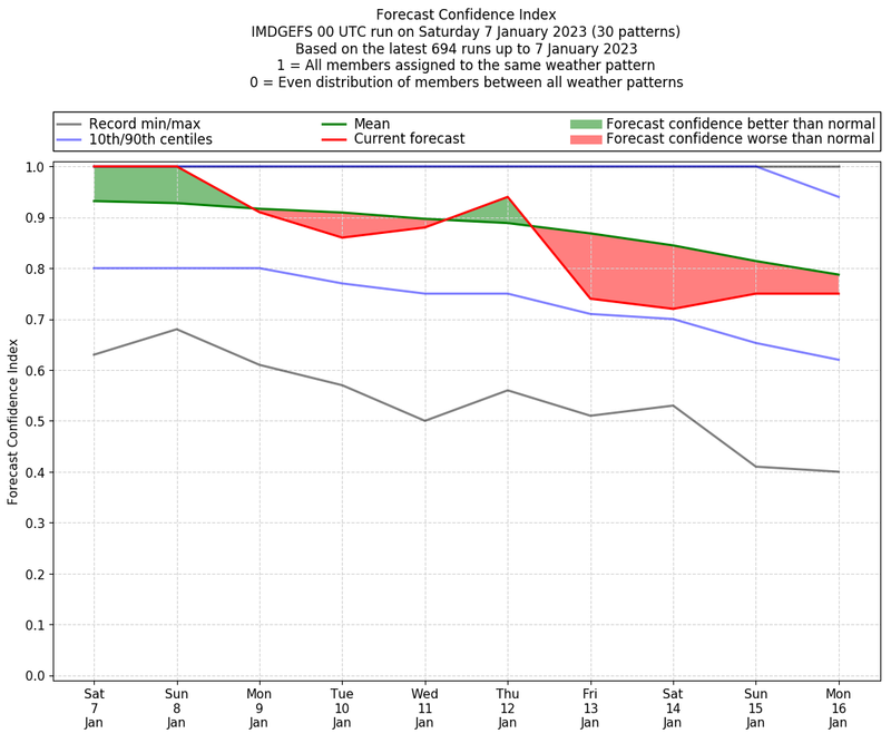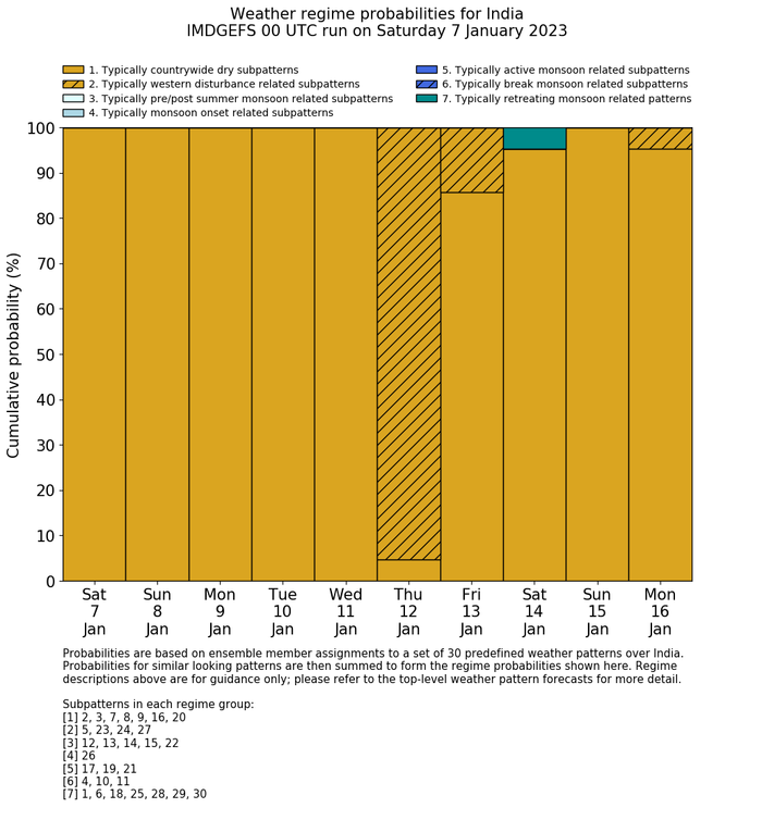 | Weather patterns typically associated with contrywide dry period tendencies over India are most likely Weather patterns 2, 3, 7, 8, 9, 16 and 20 (countrywide winter dry period) | |