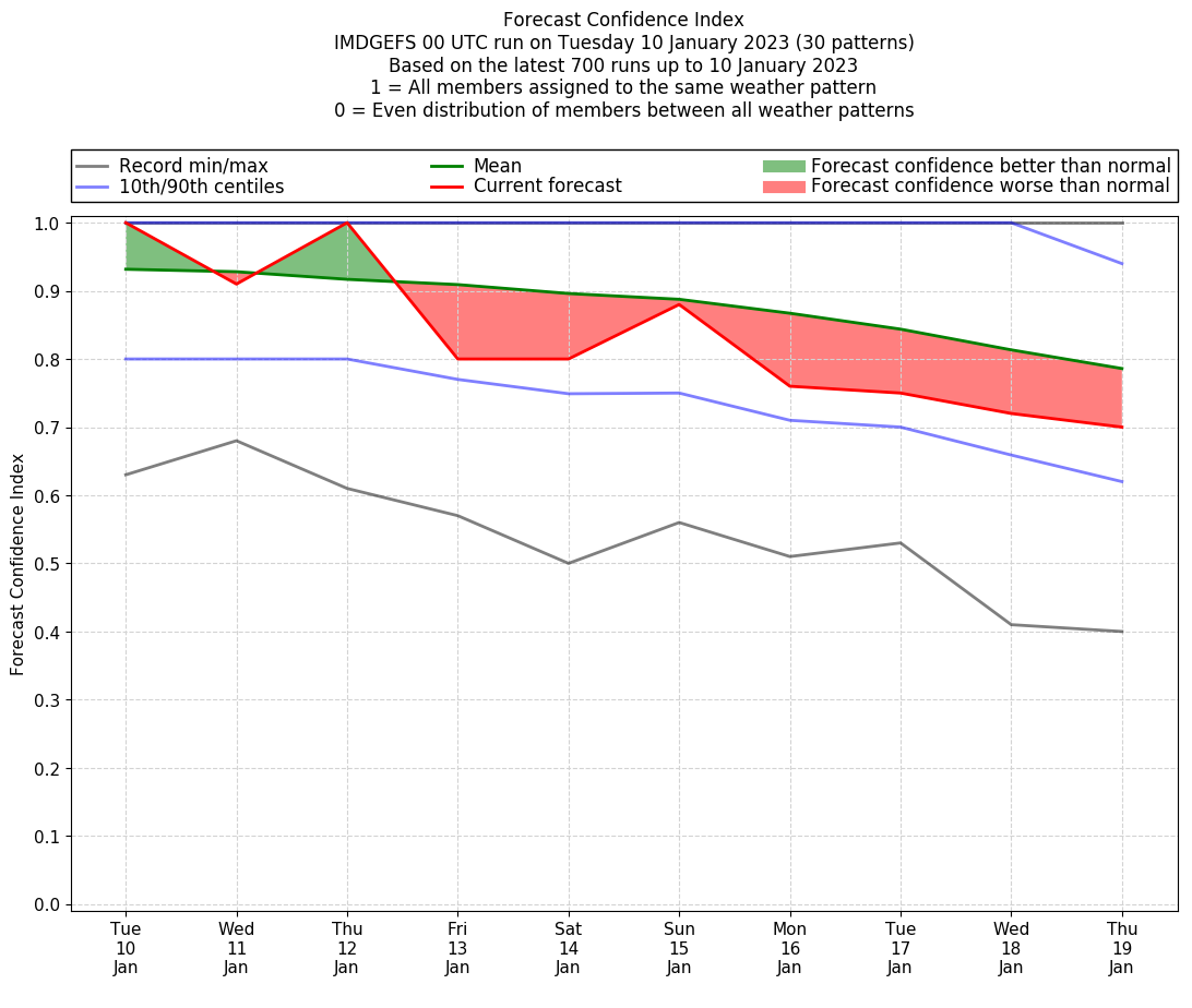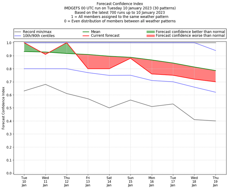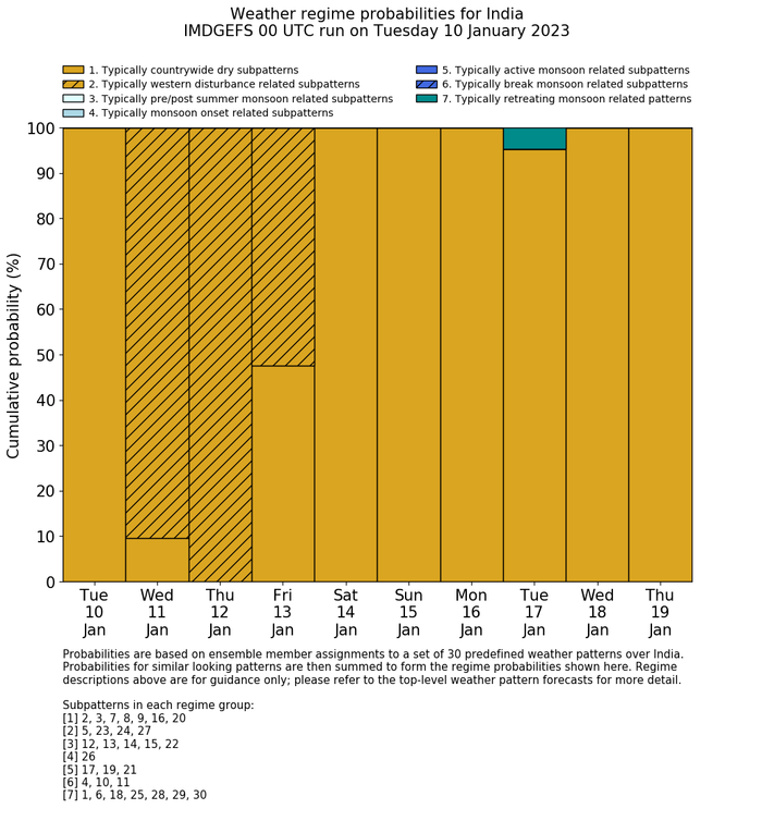 | Weather patterns typically associated with contrywide dry period tendencies over India are most likely Weather patterns 2, 3, 7, 8, 9, 16 and 20 (countrywide winter dry period) | |