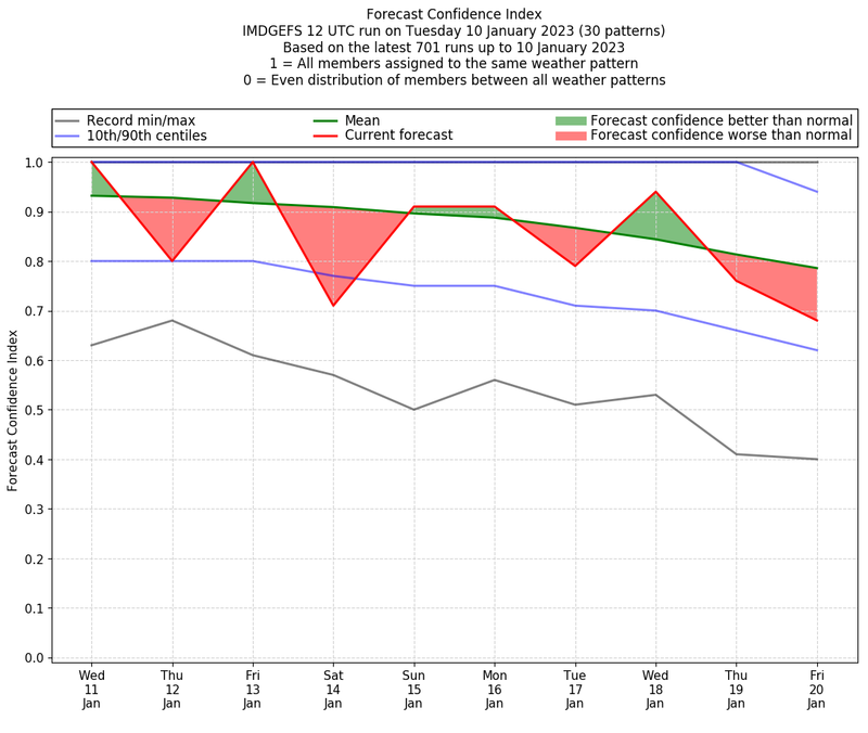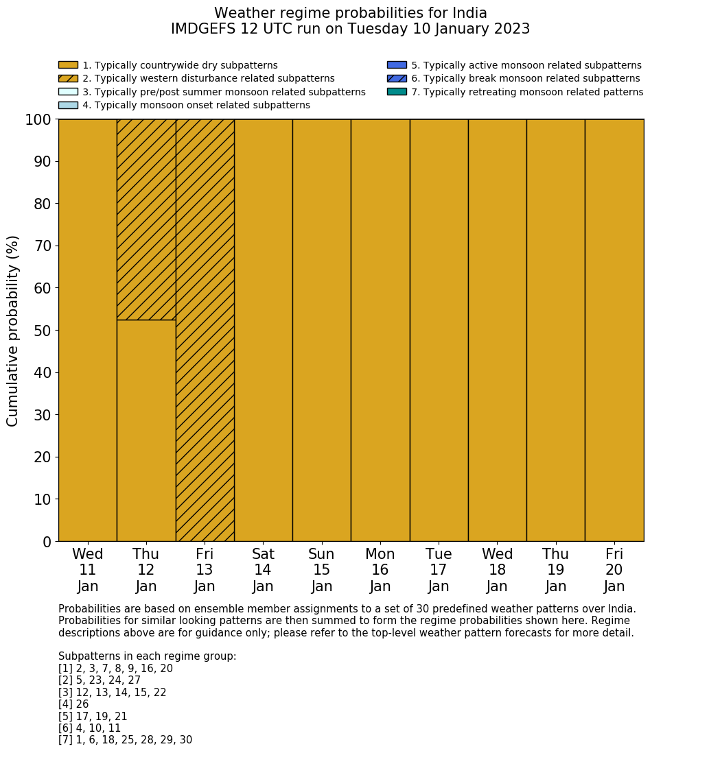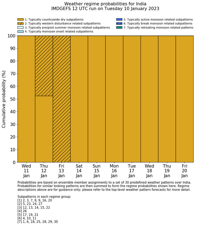 | Weather patterns typically associated with contrywide dry period tendencies over India are most likely Weather patterns 2, 3, 7, 8, 9, 16 and 20 (countrywide winter dry period) | |