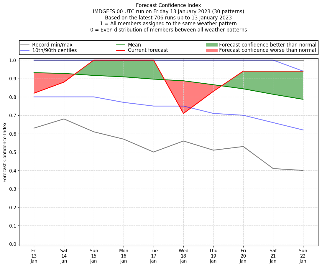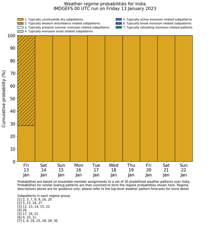 | Weather patterns typically associated with contrywide dry period tendencies over India are most likely Weather patterns 2, 3, 7, 8, 9, 16 and 20 (countrywide winter dry period) | |