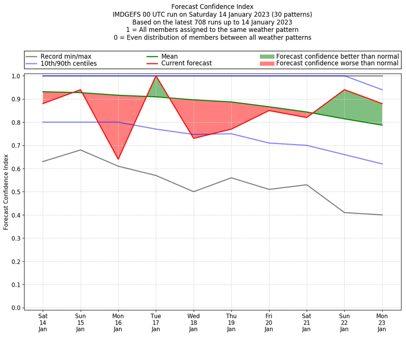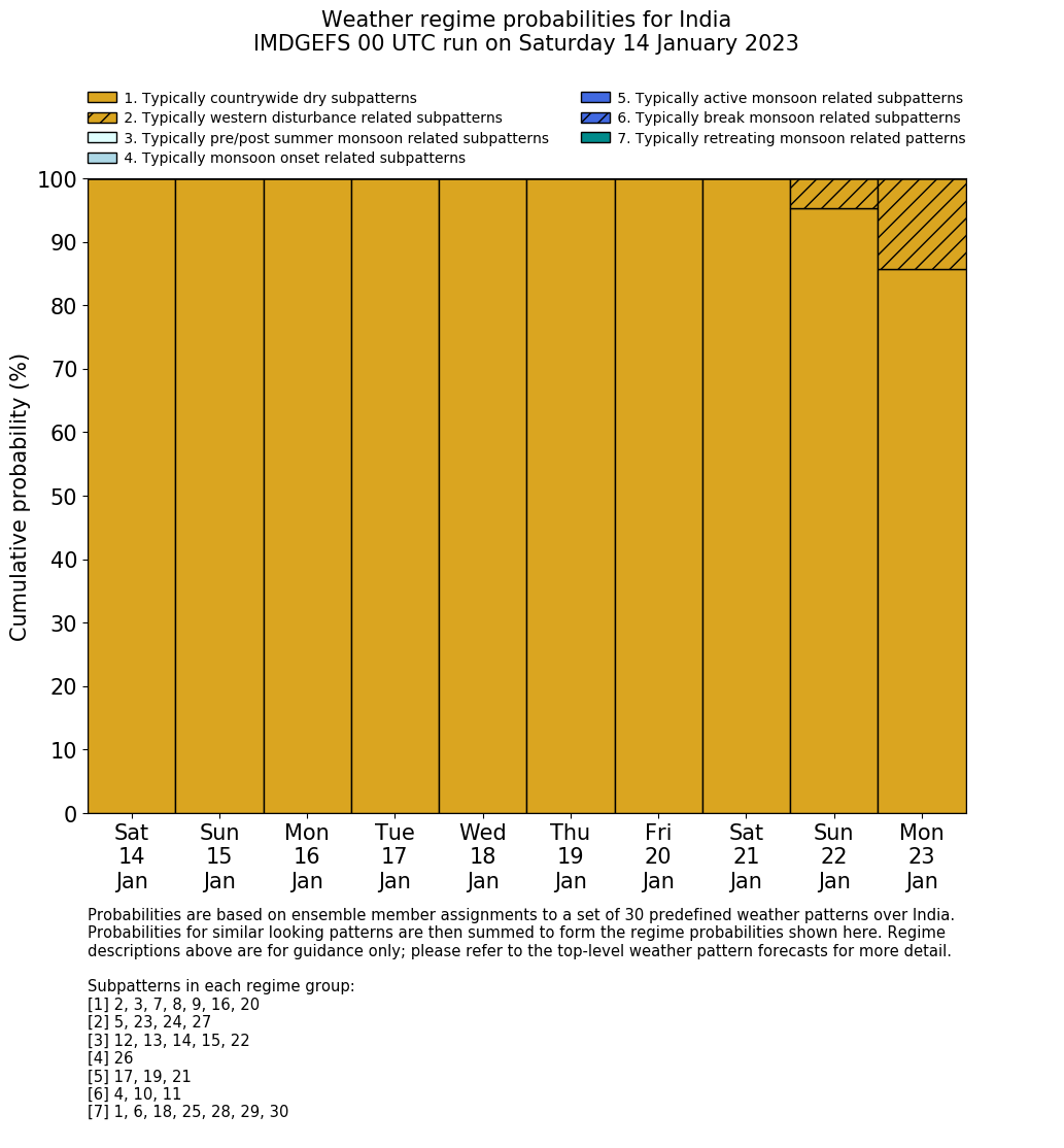 | Weather patterns typically associated with contrywide dry period tendencies over India are most likely Weather patterns 2, 3, 7, 8, 9, 16 and 20 (countrywide winter dry period) | |
