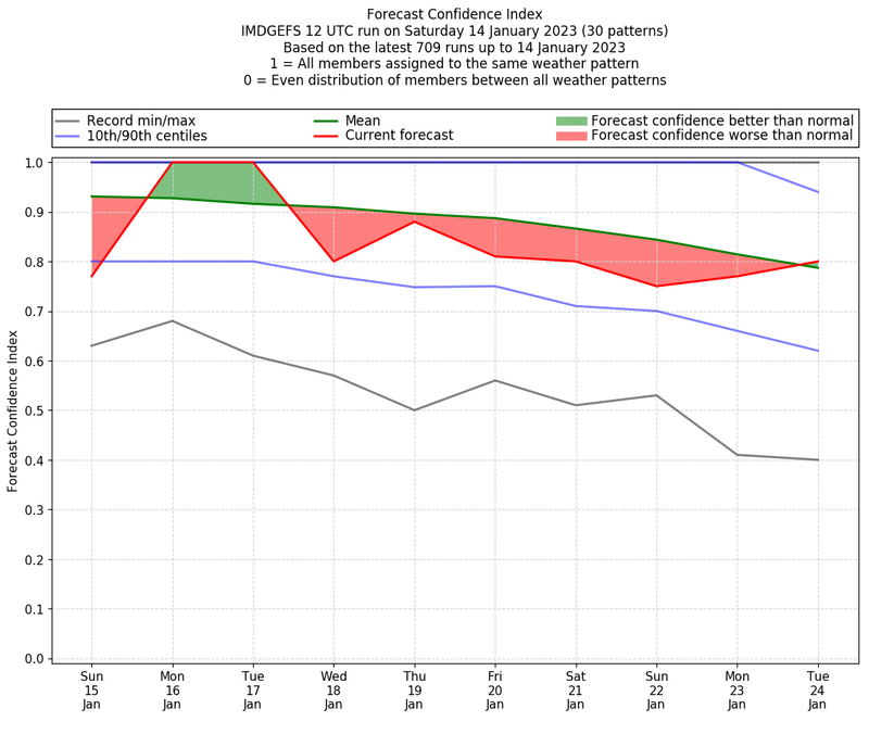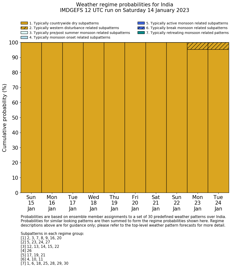 | Weather patterns typically associated with contrywide dry period tendencies over India are most likely Weather patterns 2, 3, 7, 8, 9, 16 and 20 (countrywide winter dry period) | |