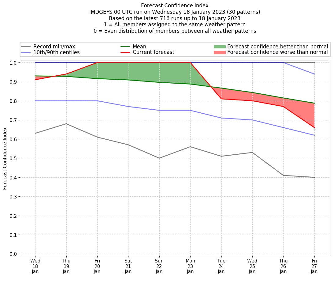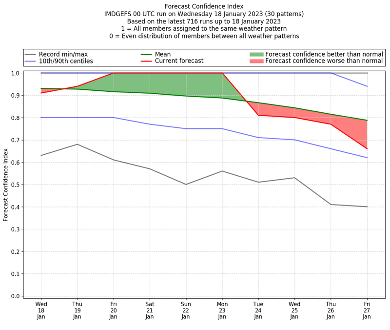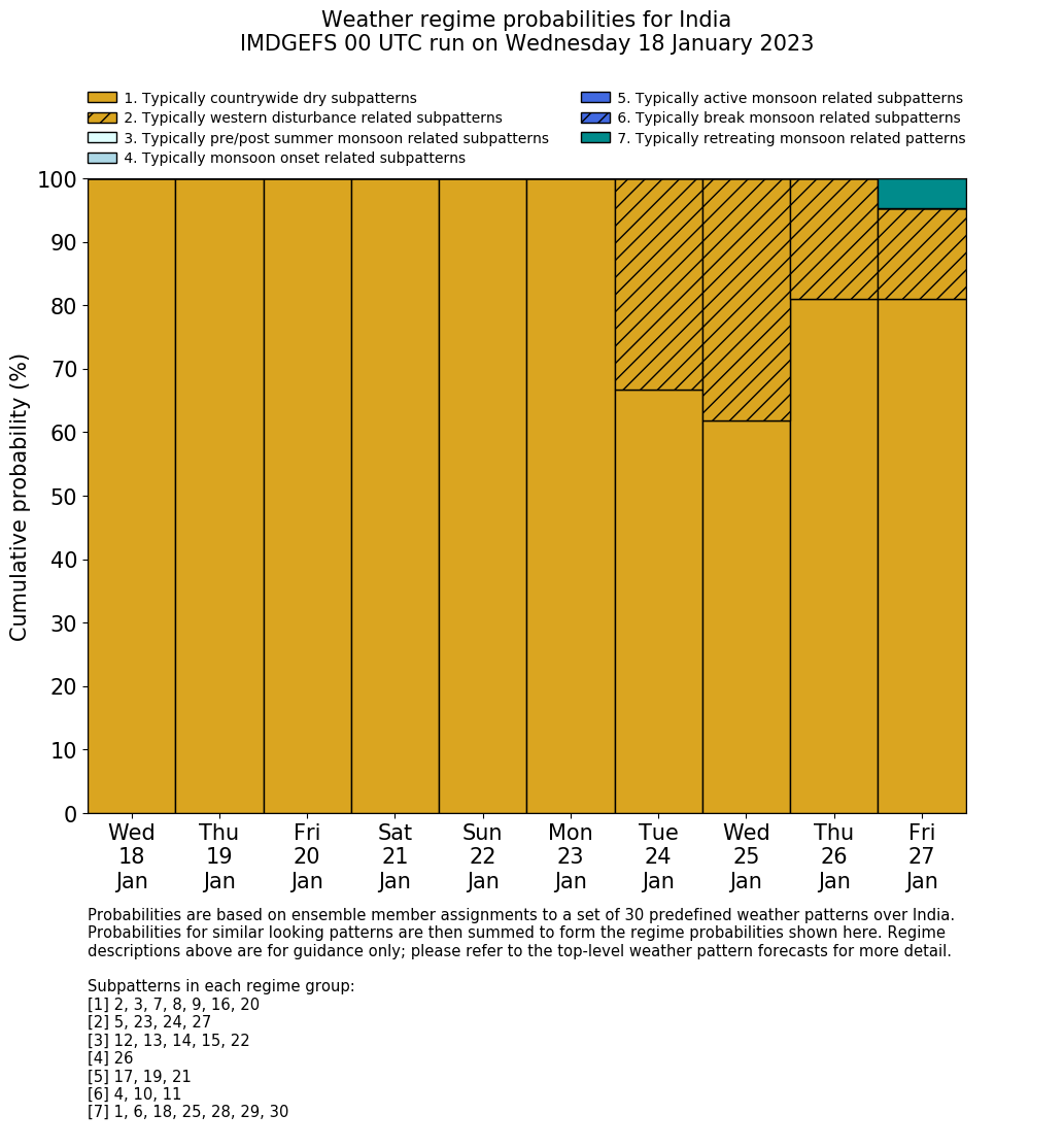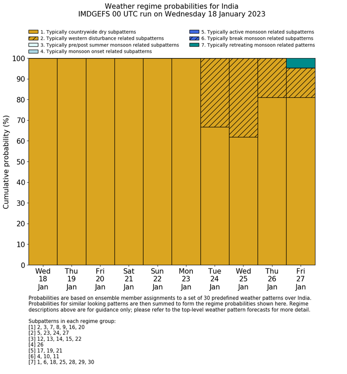 | Weather patterns typically associated with contrywide dry period tendencies over India are most likely Weather patterns 2, 3, 7, 8, 9, 16 and 20 (countrywide winter dry period) | |