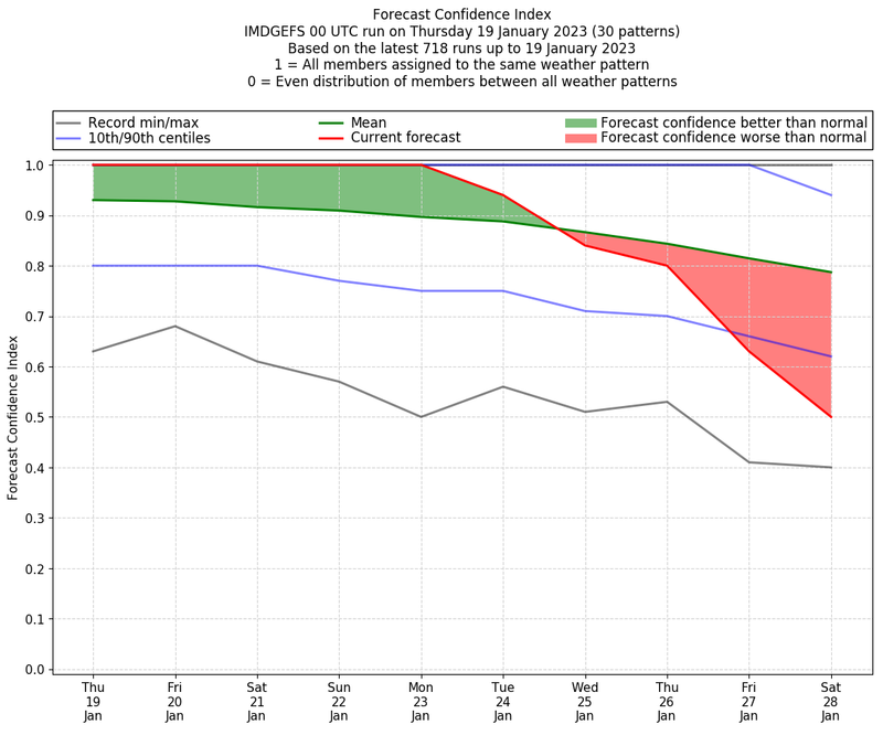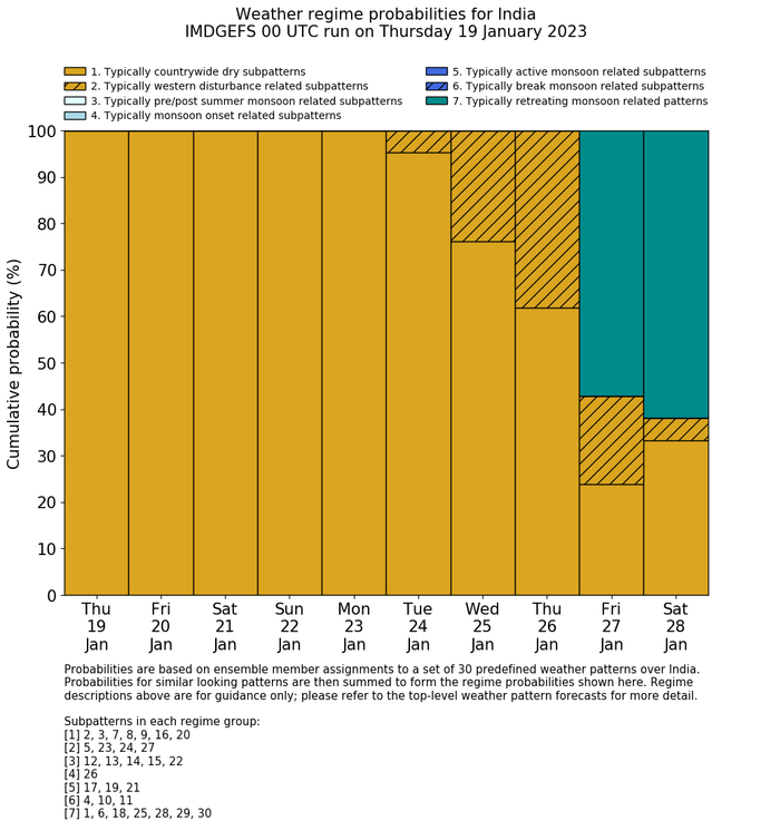 | Weather patterns typically associated with contrywide dry period tendencies over India are most likely Weather patterns 2, 3, 7, 8, 9, 16 and 20 (countrywide winter dry period) | |