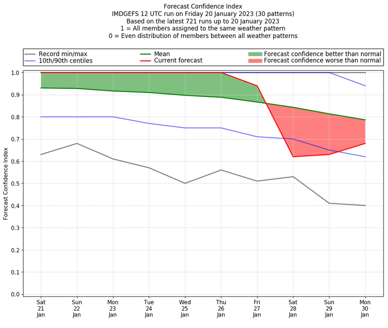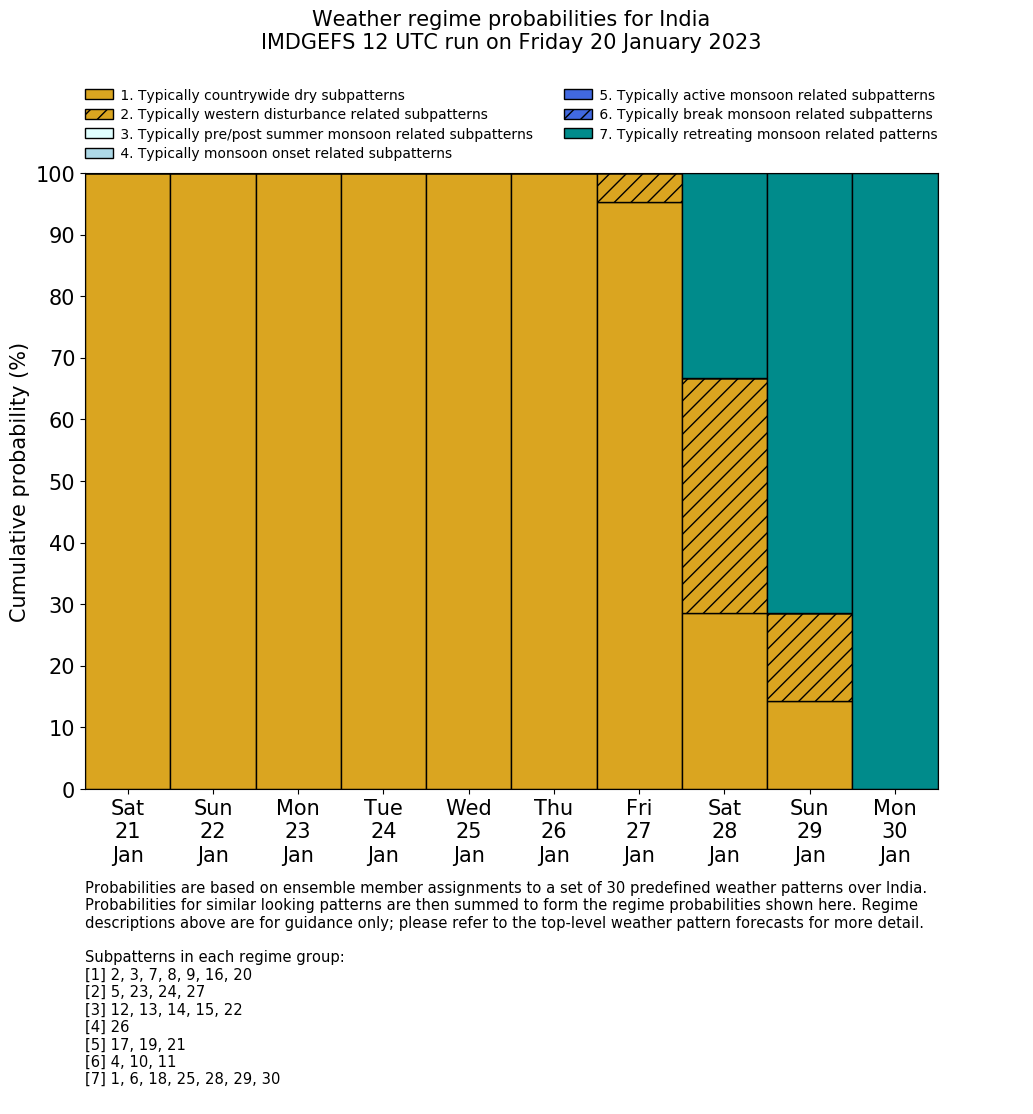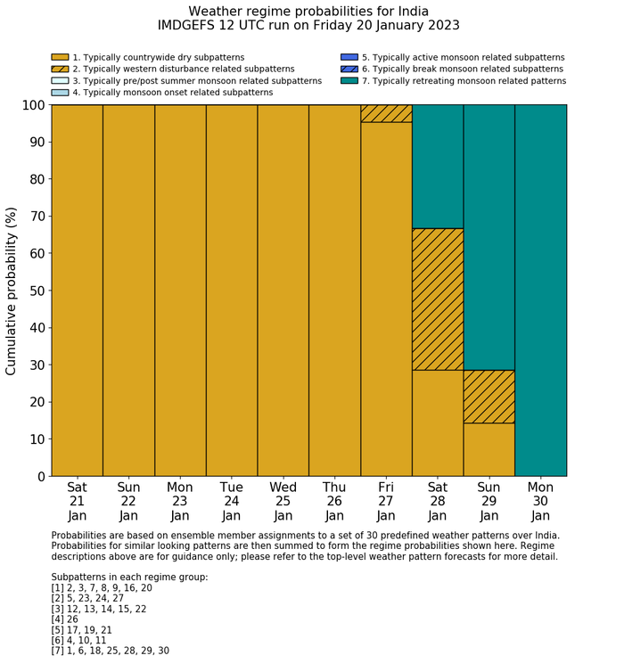 | Weather patterns typically associated with contrywide dry period tendencies over India are most likely Weather patterns 2, 3, 7, 8, 9, 16 and 20 (countrywide winter dry period) | |