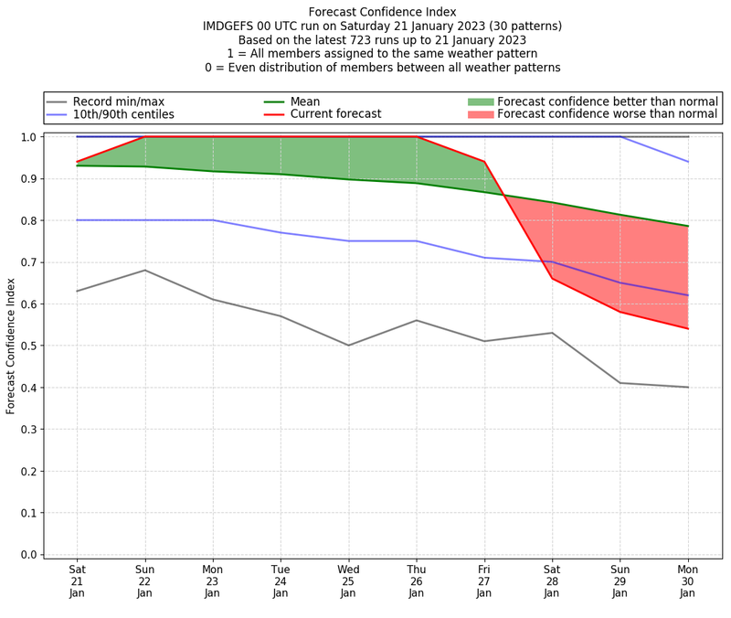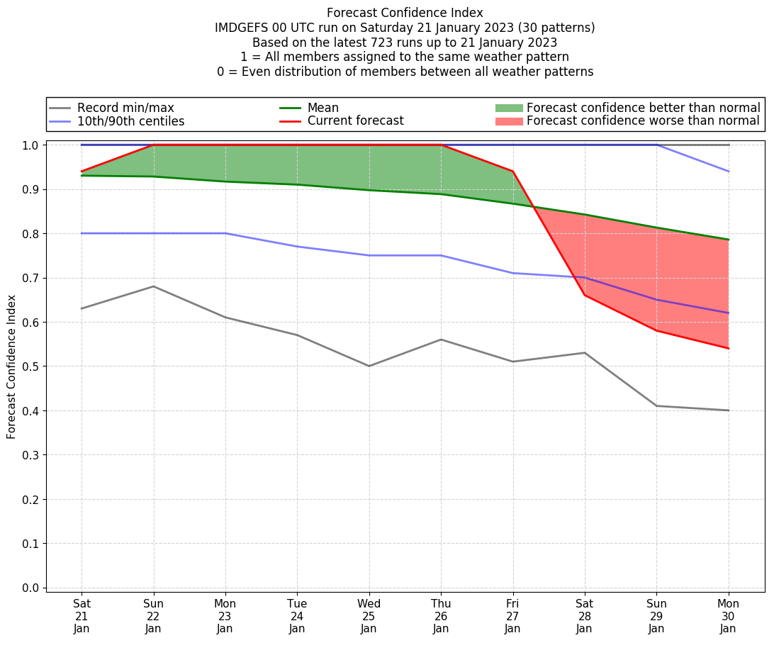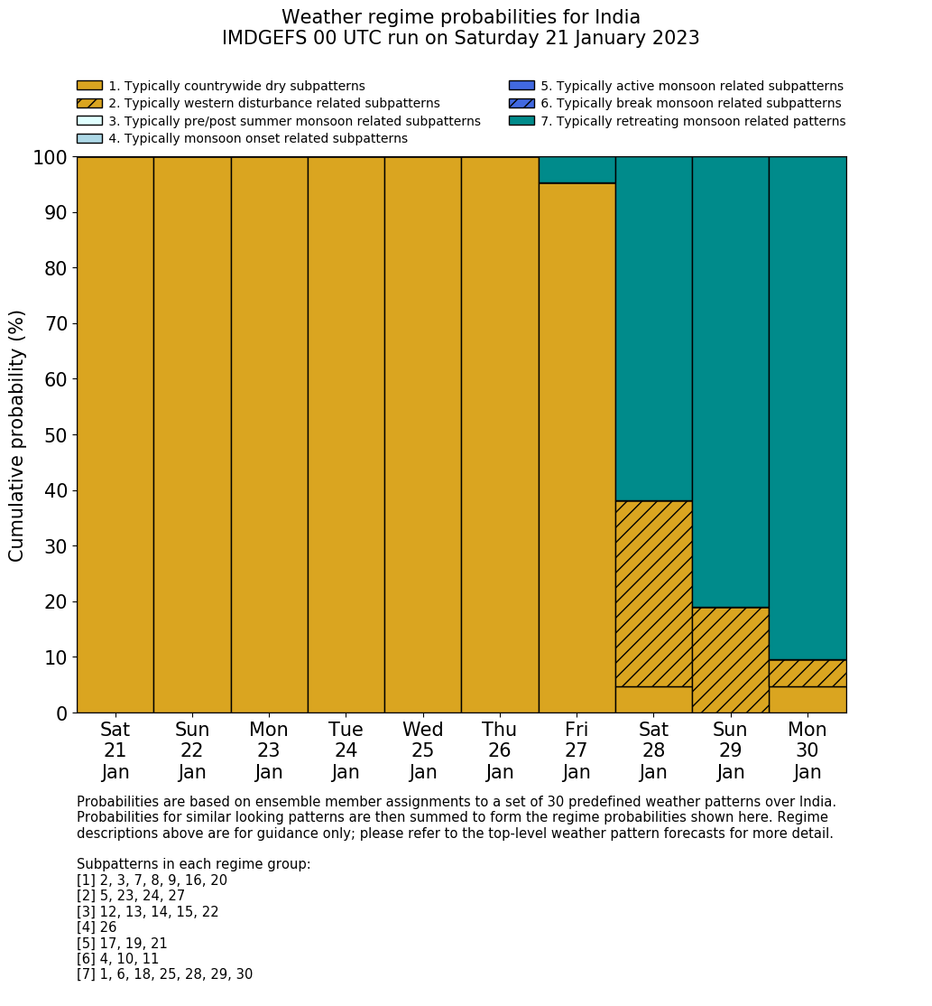 | Weather patterns typically associated with contrywide dry period tendencies over India are most likely Weather patterns 2, 3, 7, 8, 9, 16 and 20 (countrywide winter dry period) | |