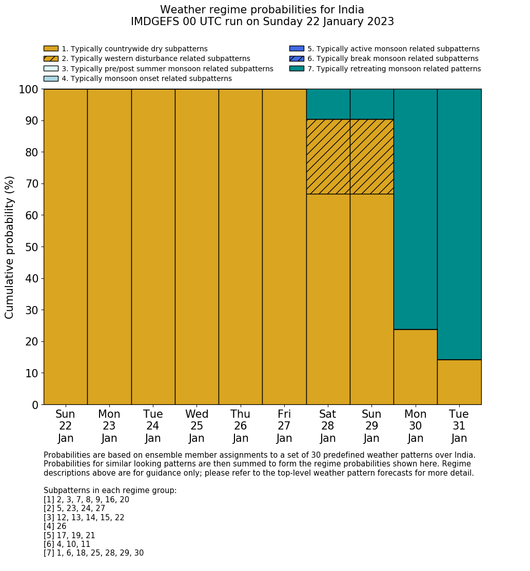 | Weather patterns typically associated with contrywide dry period tendencies over India are most likely Weather patterns 2, 3, 7, 8, 9, 16 and 20 (countrywide winter dry period) | |