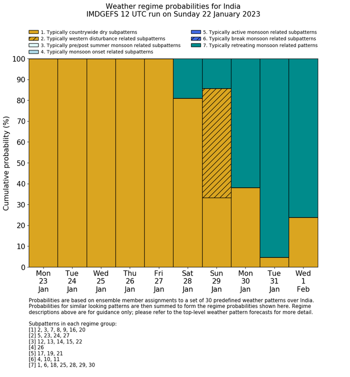 | Weather patterns typically associated with contrywide dry period tendencies over India are most likely Weather patterns 2, 3, 7, 8, 9, 16 and 20 (countrywide winter dry period) | |