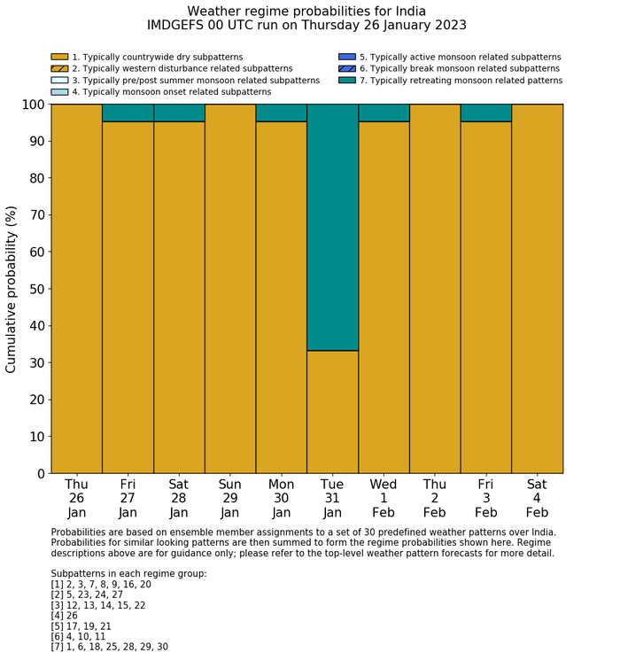 | Weather patterns typically associated with contrywide dry period tendencies over India are most likely Weather patterns 2, 3, 7, 8, 9, 16 and 20 (countrywide winter dry period) | |