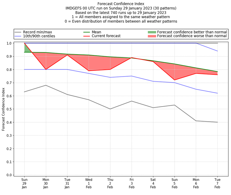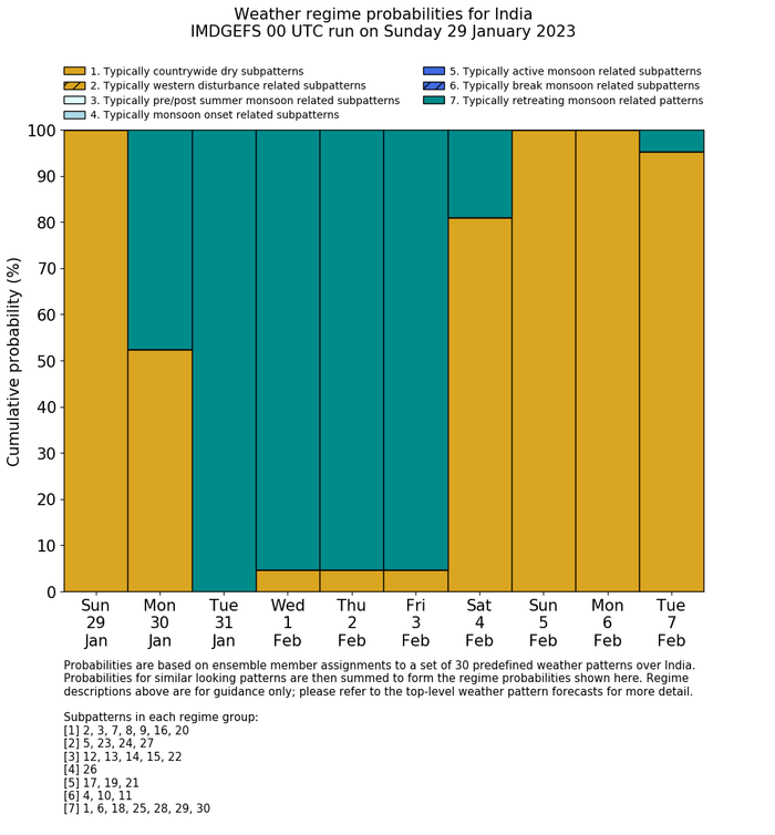 | Weather patterns typically associated with contrywide dry period tendencies over India are most likely Weather patterns 2, 3, 7, 8, 9, 16 and 20 (countrywide winter dry period) | |