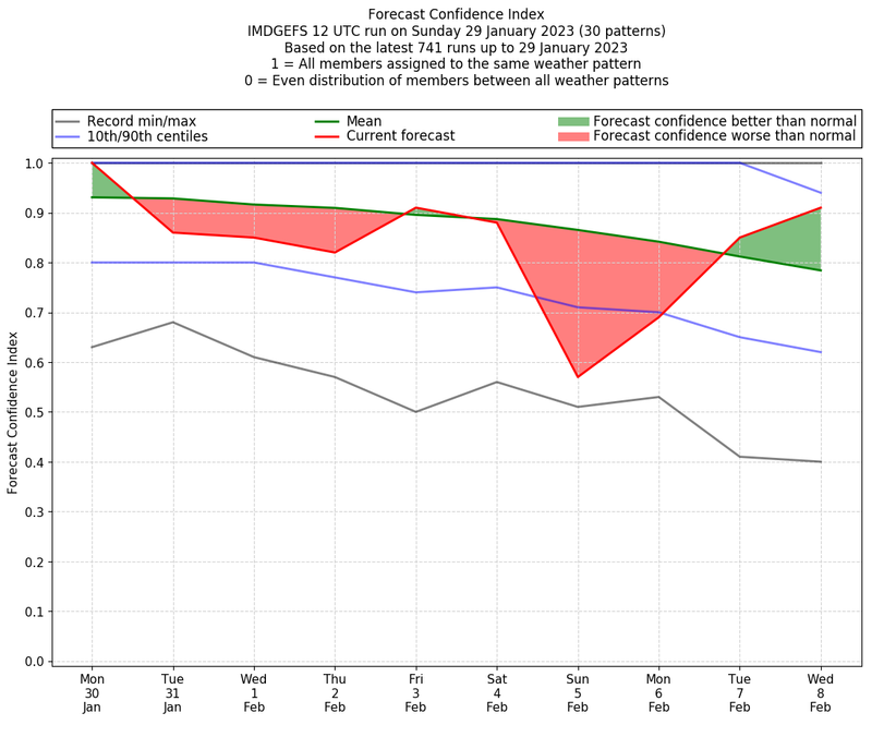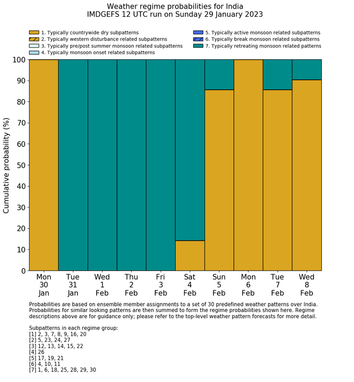 | Weather patterns typically associated with contrywide dry period tendencies over India are most likely Weather patterns 2, 3, 7, 8, 9, 16 and 20 (countrywide winter dry period) | |