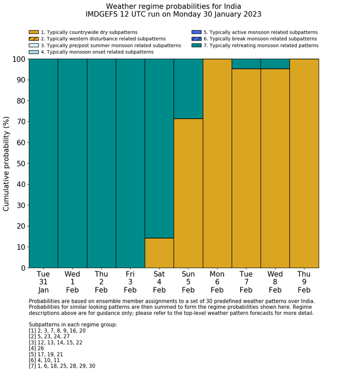 | Weather patterns typically associated with contrywide dry period tendencies over India are most likely Weather patterns 2, 3, 7, 8, 9, 16 and 20 (countrywide winter dry period) | |