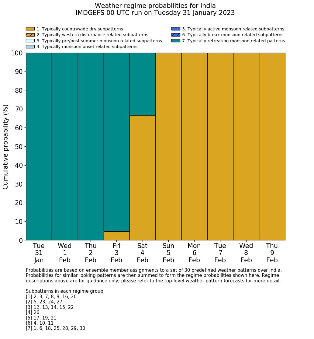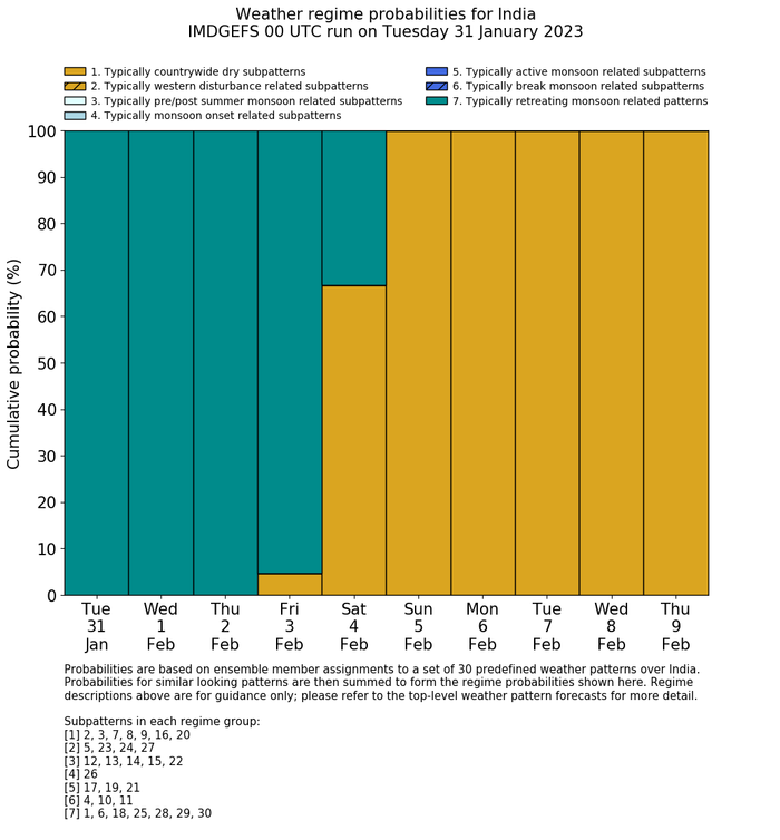 | Weather patterns typically associated with contrywide dry period tendencies over India are most likely Weather patterns 2, 3, 7, 8, 9, 16 and 20 (countrywide winter dry period) | |