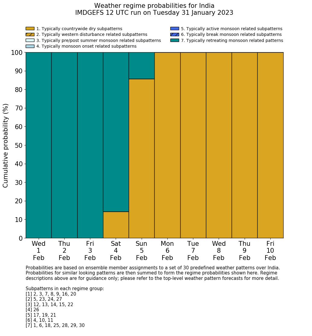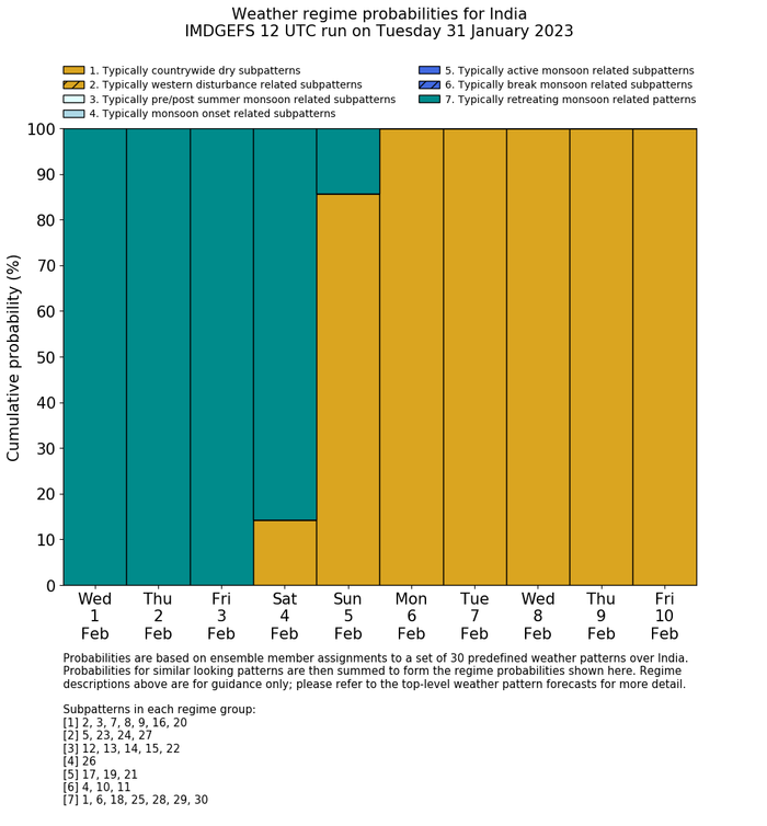 | Weather patterns typically associated with contrywide dry period tendencies over India are most likely Weather patterns 2, 3, 7, 8, 9, 16 and 20 (countrywide winter dry period) | |