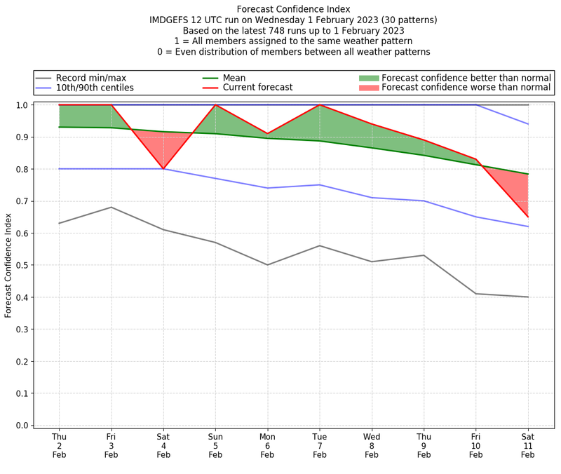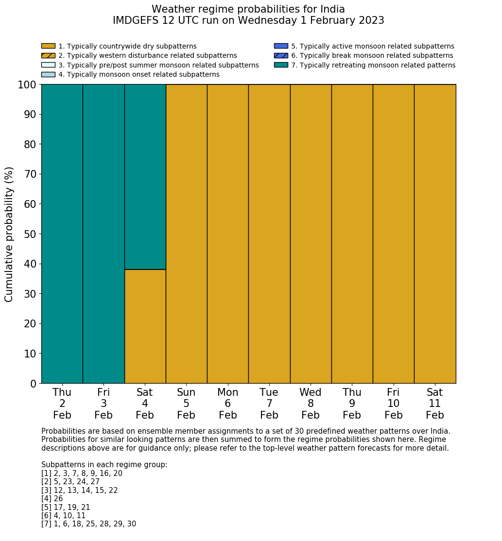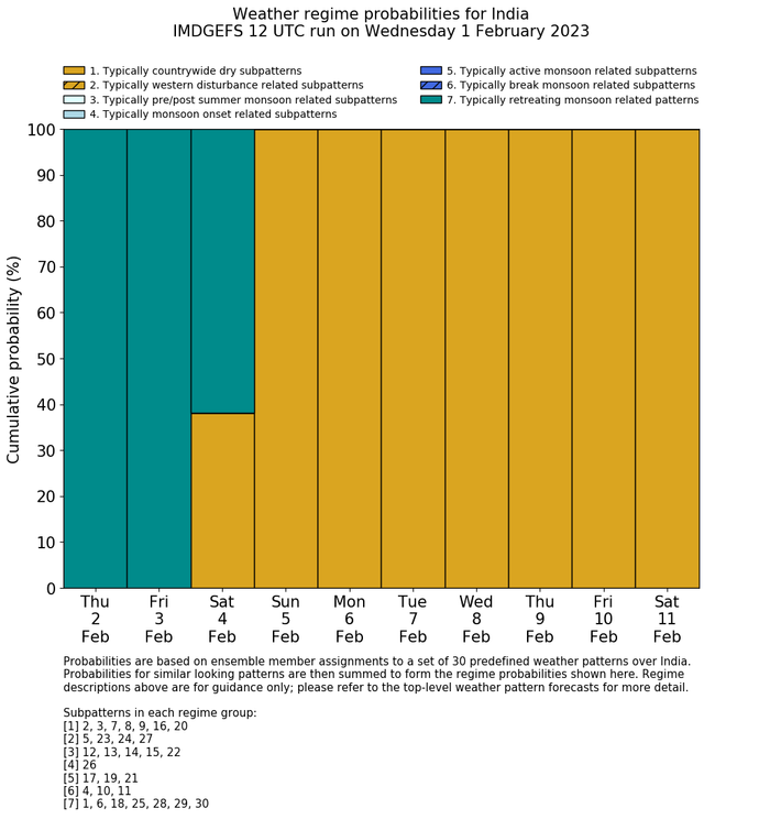 | Weather patterns typically associated with contrywide dry period tendencies over India are most likely Weather patterns 2, 3, 7, 8, 9, 16 and 20 (countrywide winter dry period) | |